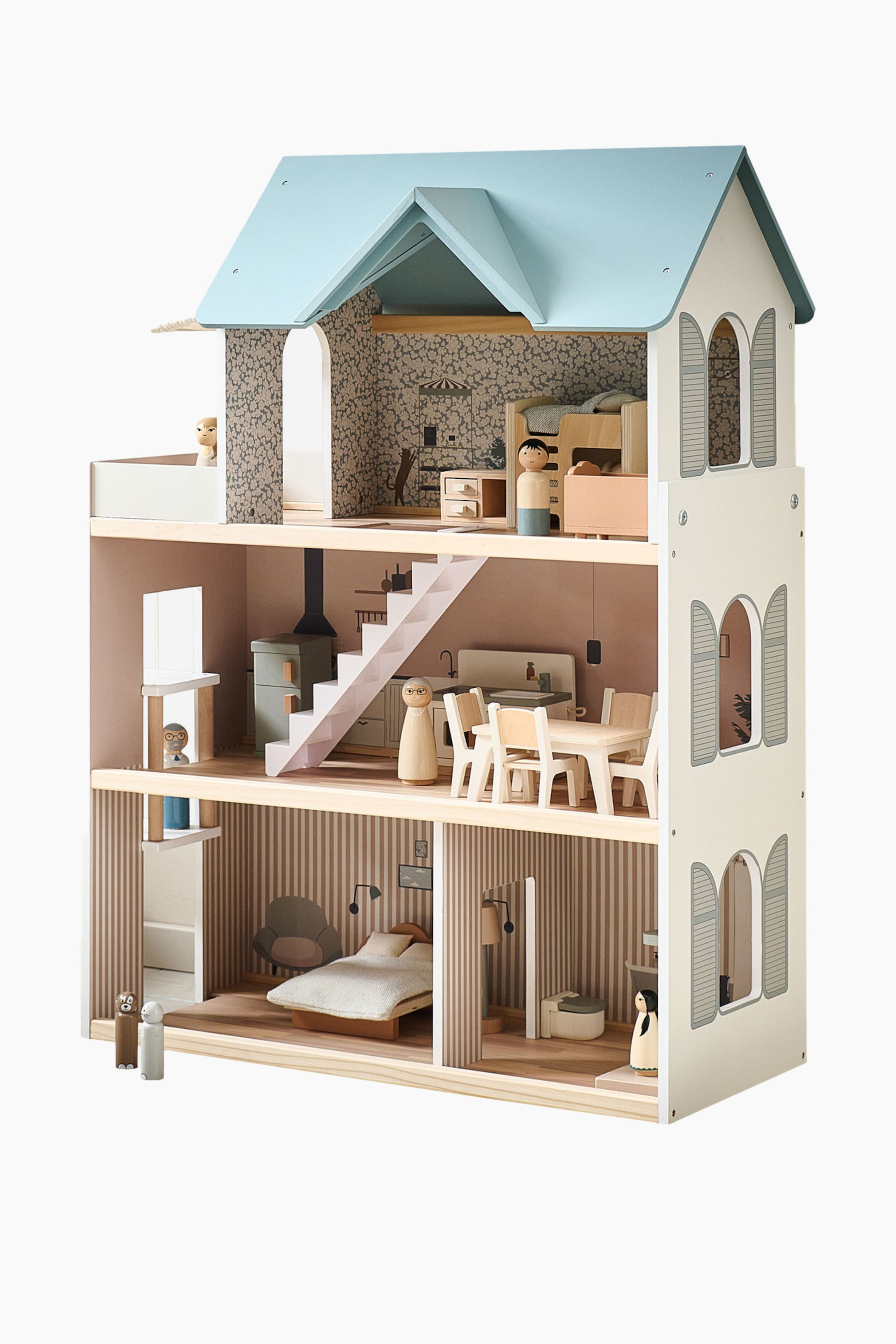 This wooden dollhouse Campagne offers a charming play environment with three floors, stairs, and a lift that encourage motor skills and imaginative roleplay for children from 3 years old. Its timeless design creates a calming setting for storytelling and coordination as children arrange the included 14-piece furniture set. Made from sturdy MDF, this dollhouse invites creative exploration and social play, making it a smart choice for developing fine motor skills and nurturing imagination. Dimensions: Length 60 cm × Width 26 cm × Height 81 cm