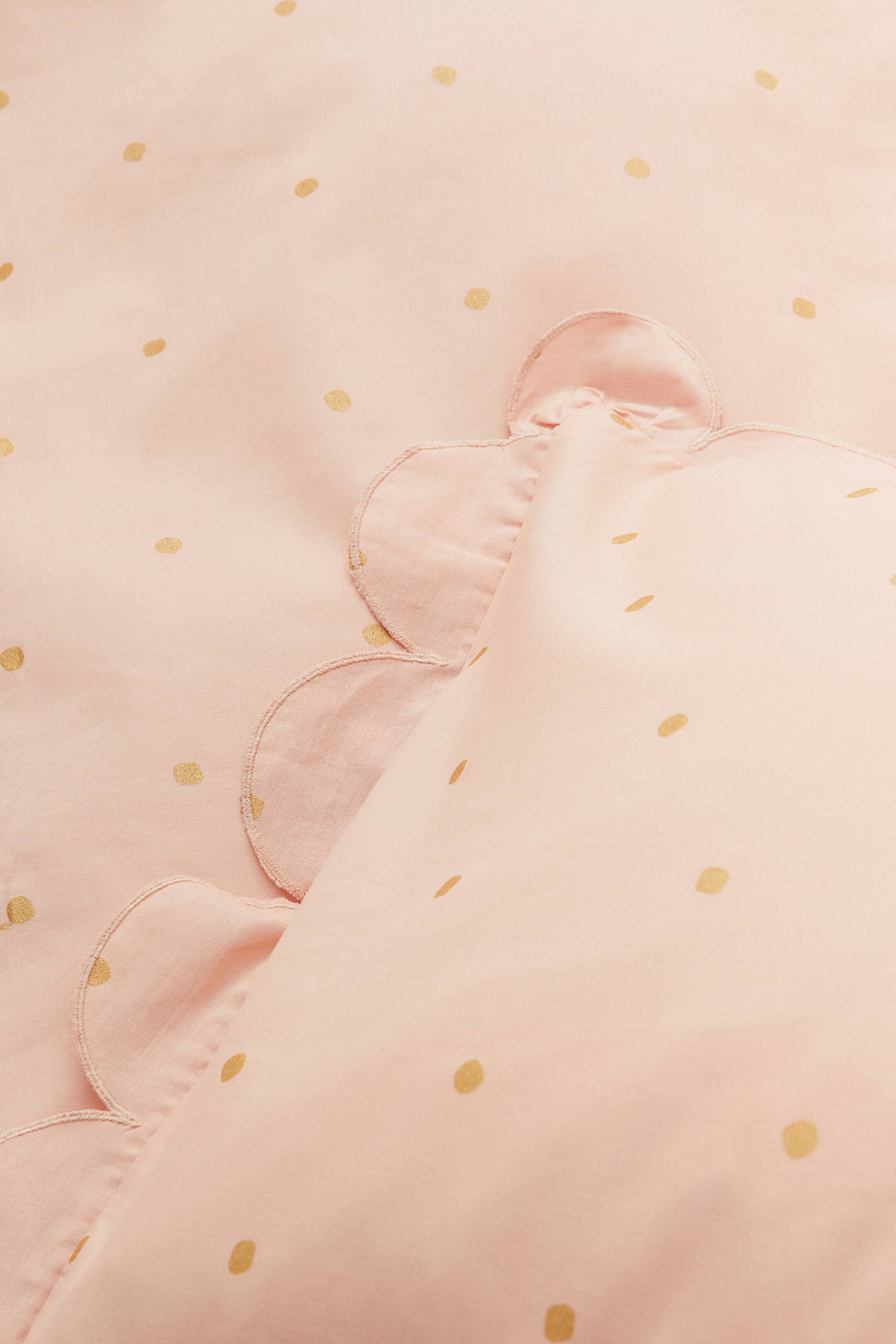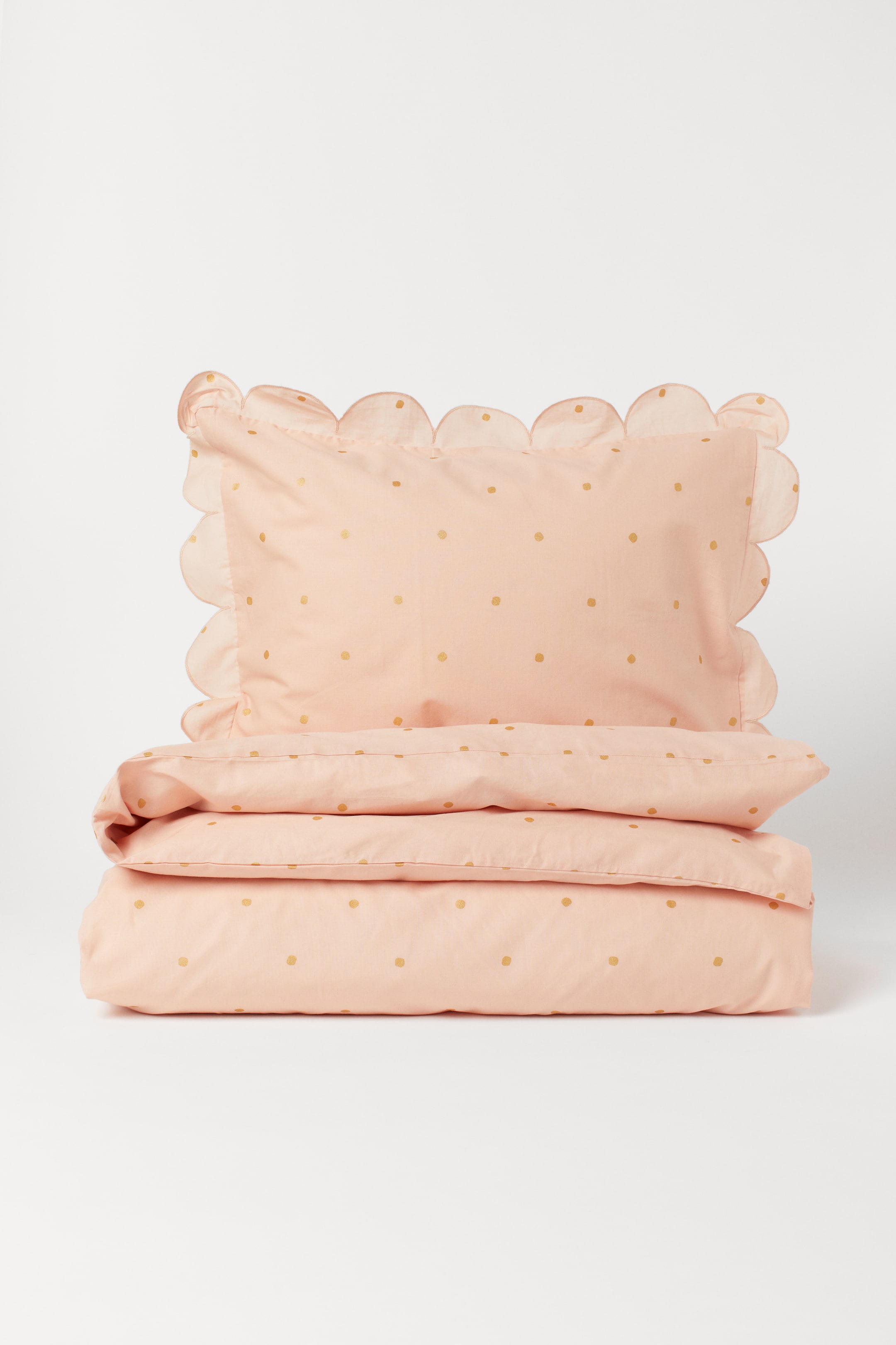 Een eenpersoonsdekbedset van katoen (30/30-garen, draaddichtheid 144) met een geprint dessin. Het dekbedovertrek heeft een decoratief golvend randje aan de bovenkant. Eén kussensloop met een golvend randje.