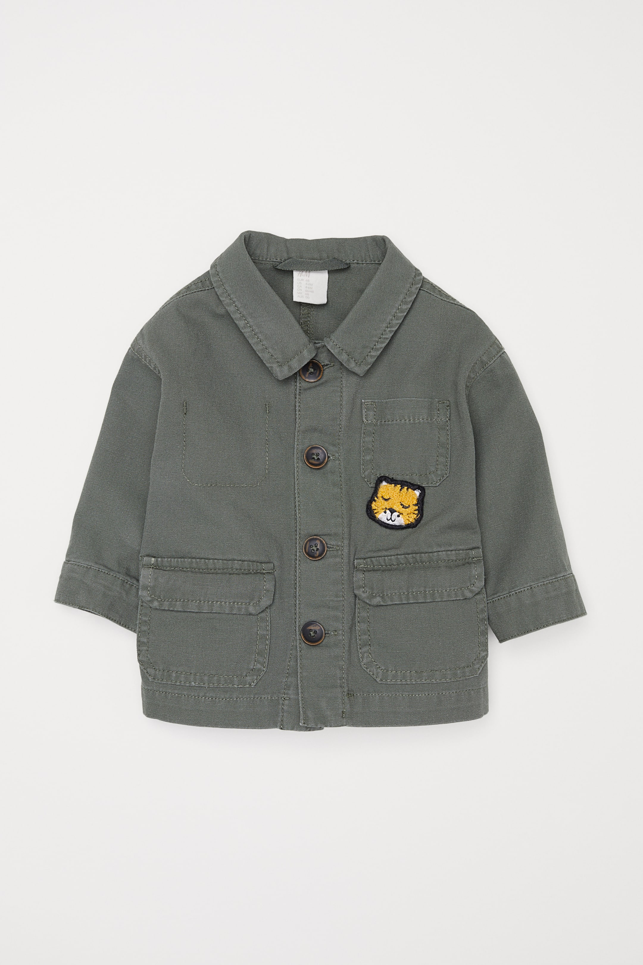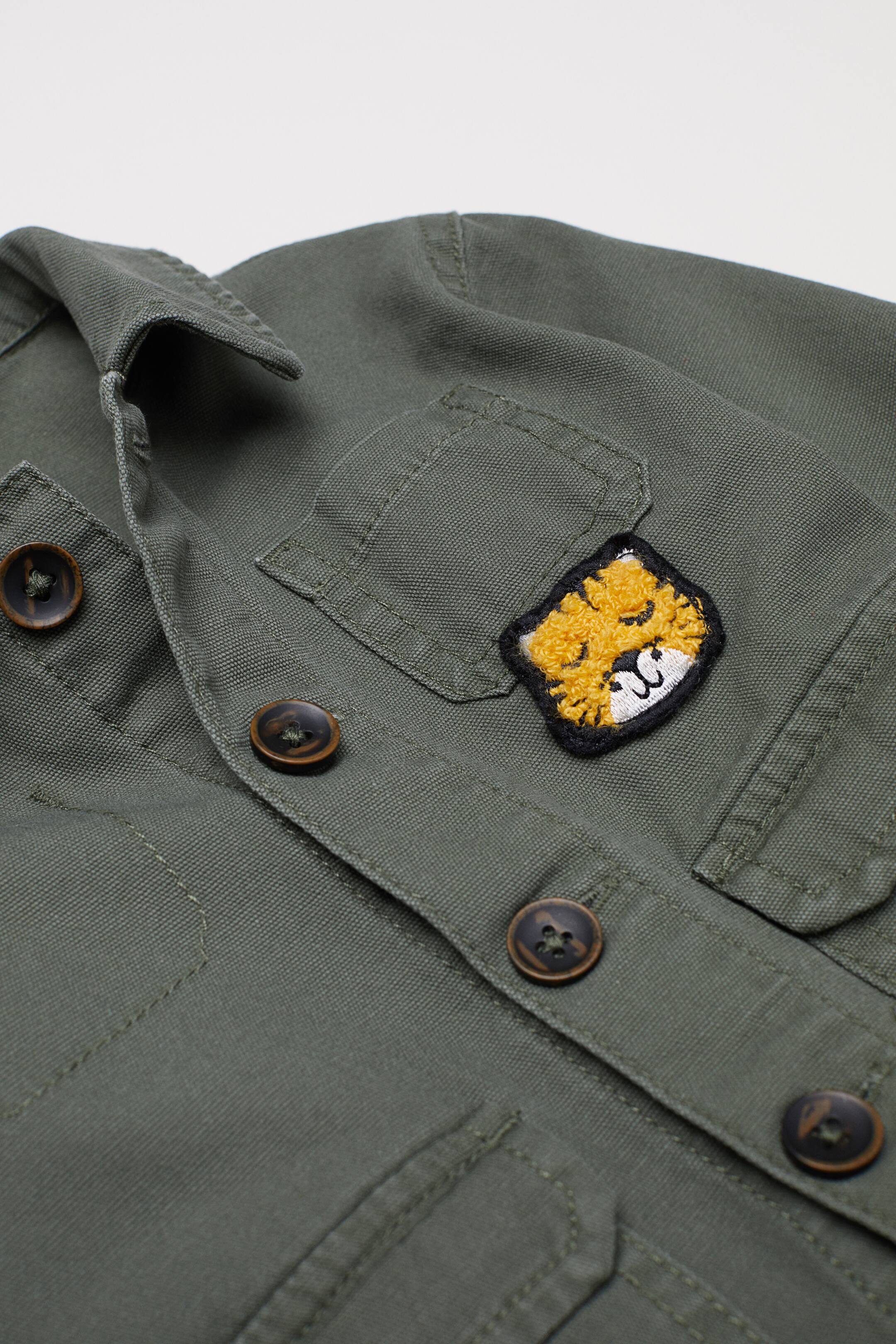Een recht utilityjack van zacht katoenen canvas met een kraag en een knoopsluiting voor. Het jack heeft een borstzak met een applicatie, grote voorzakken met klep en een manchet met sluiting onder aan de mouwen. Ongevoerd.