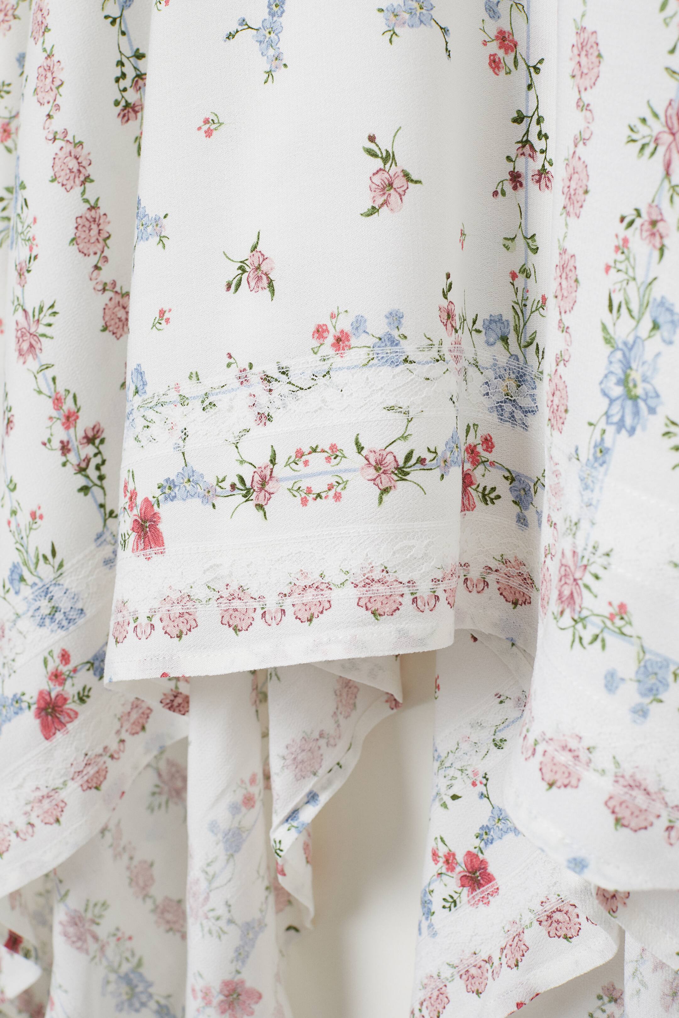 Een mouwloze jurk van geweven viscose met een geprint dessin. De jurk heeft een naad in de taille, een blinde ritssluiting aan de zijkant en een licht uitlopende, asymmetrische rok met decoratieve kanten biezen onderaan. Ongevoerd.