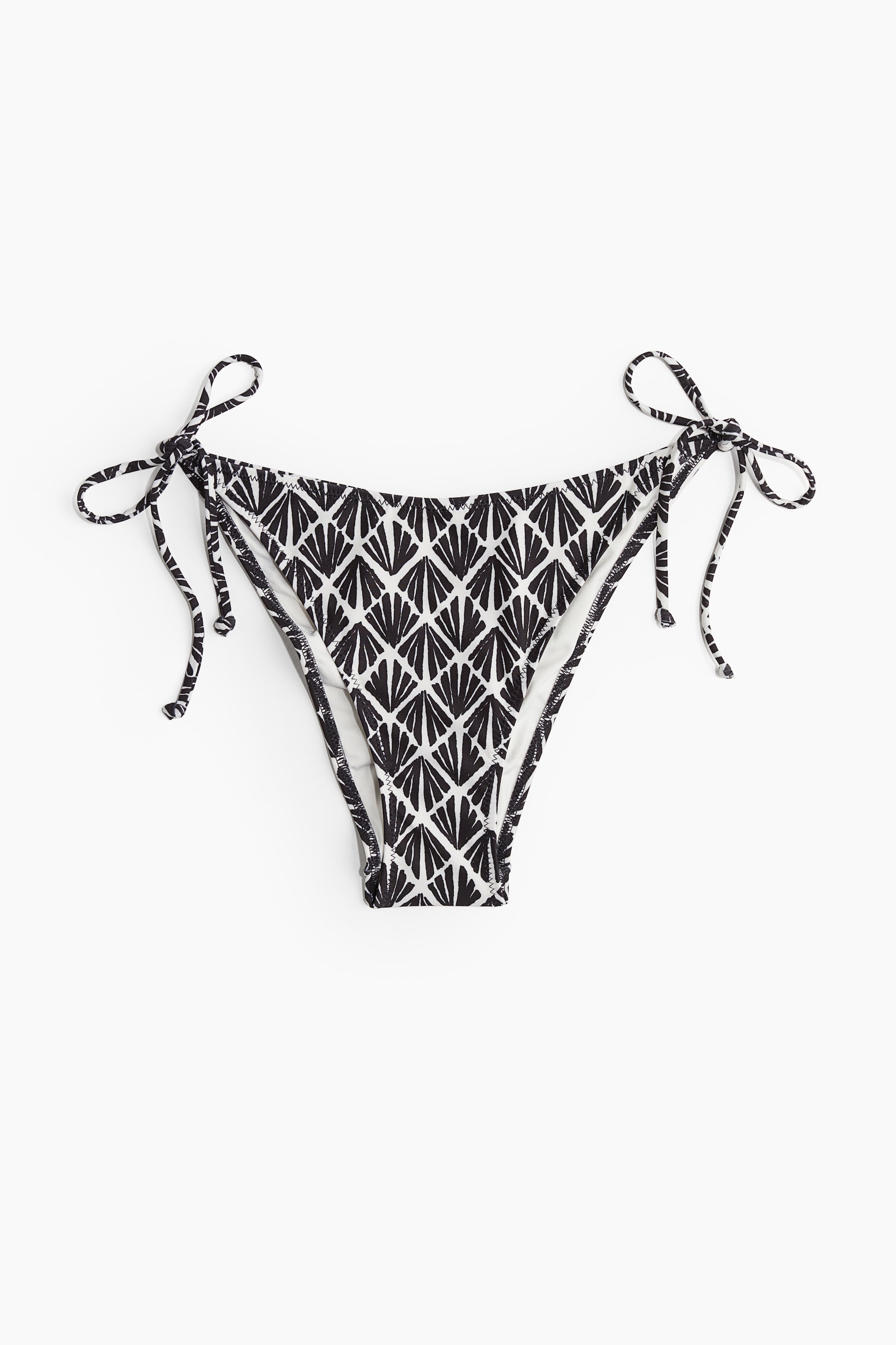 Een geheel gevoerde bikinislip met strikbandjes aan de zijkanten. De slip heeft een normale taille en een iets hoger uitgesneden belijning aan de achterkant.