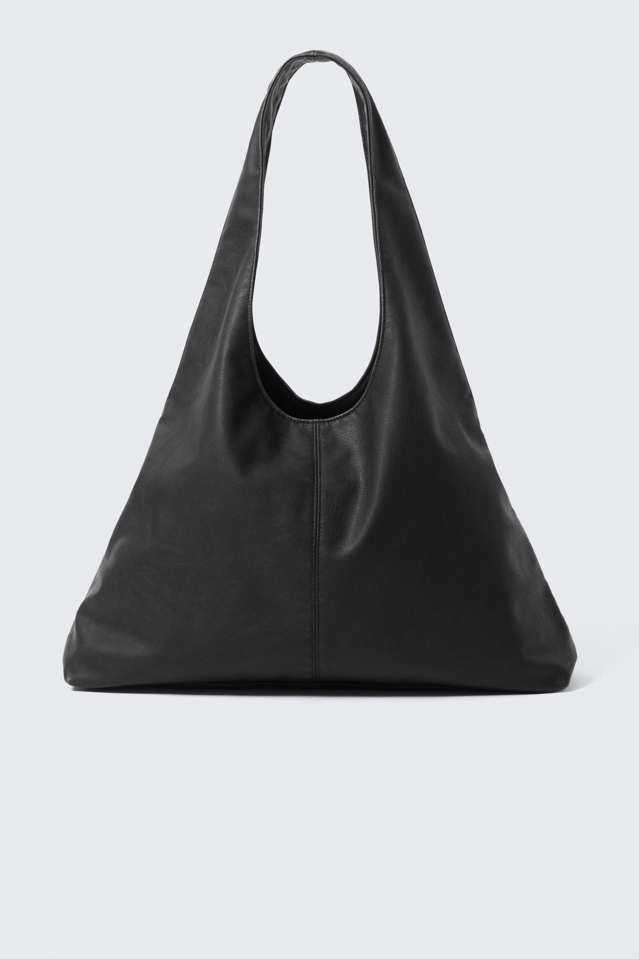Een zachte schoudertas met een slouchy driehoekig silhouet. Hij is gemaakt van glad imitatieleer en heeft een breed gevouwen handvat, een verborgen magnetische sluiting en een volledig gevoerde binnenkant. Ontworpen met een ruim hoofdvak en een binnenvak voor kleinere benodigdheden. Het is ongeveer 43 cm breed, 27 cm hoog en 12 cm diep.