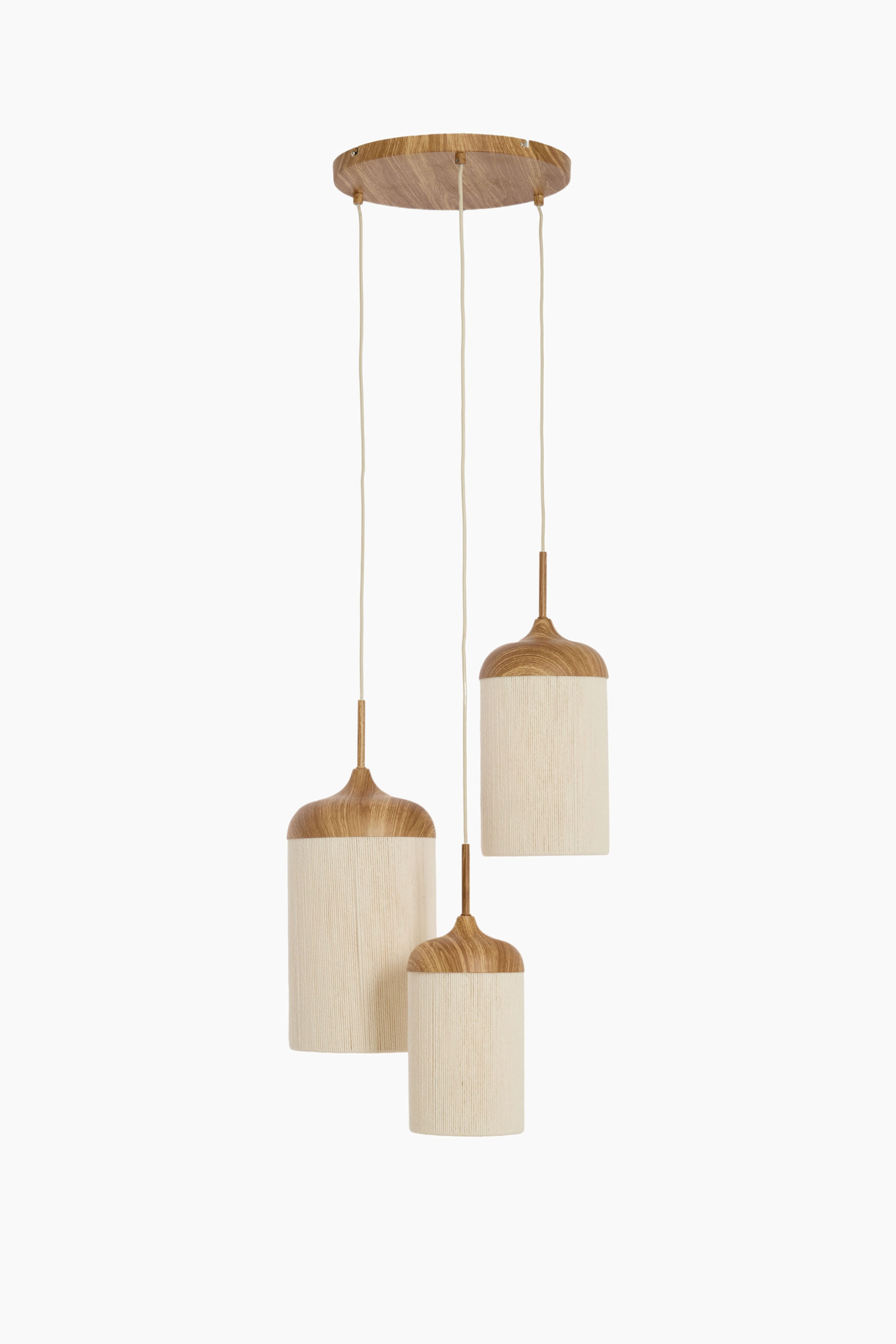Combine warmth and style in your home with this elegant 3-light Danialo pendant lamp. The natural wood and soft cream colour come together to create a calm, timeless look. The three lampshades hang at different heights, creating a playful yet harmonious effect. The shades are made of high-quality wood veneer with a smooth, matt finish. The result is that you immediately feel the quality and enjoy the warm, atmospheric light emitted by the material. Perfect above the dining table, in the living room or even in a large hall as an eye-catcher. Thanks to its neutral colour use, this lamp is a perfect fit for a Scandinavian, minimalist or Japandi living style. The sizes and heights of the cords are adjustable, so you can tailor it to your space. Dimensions: 35 x 35 x 32