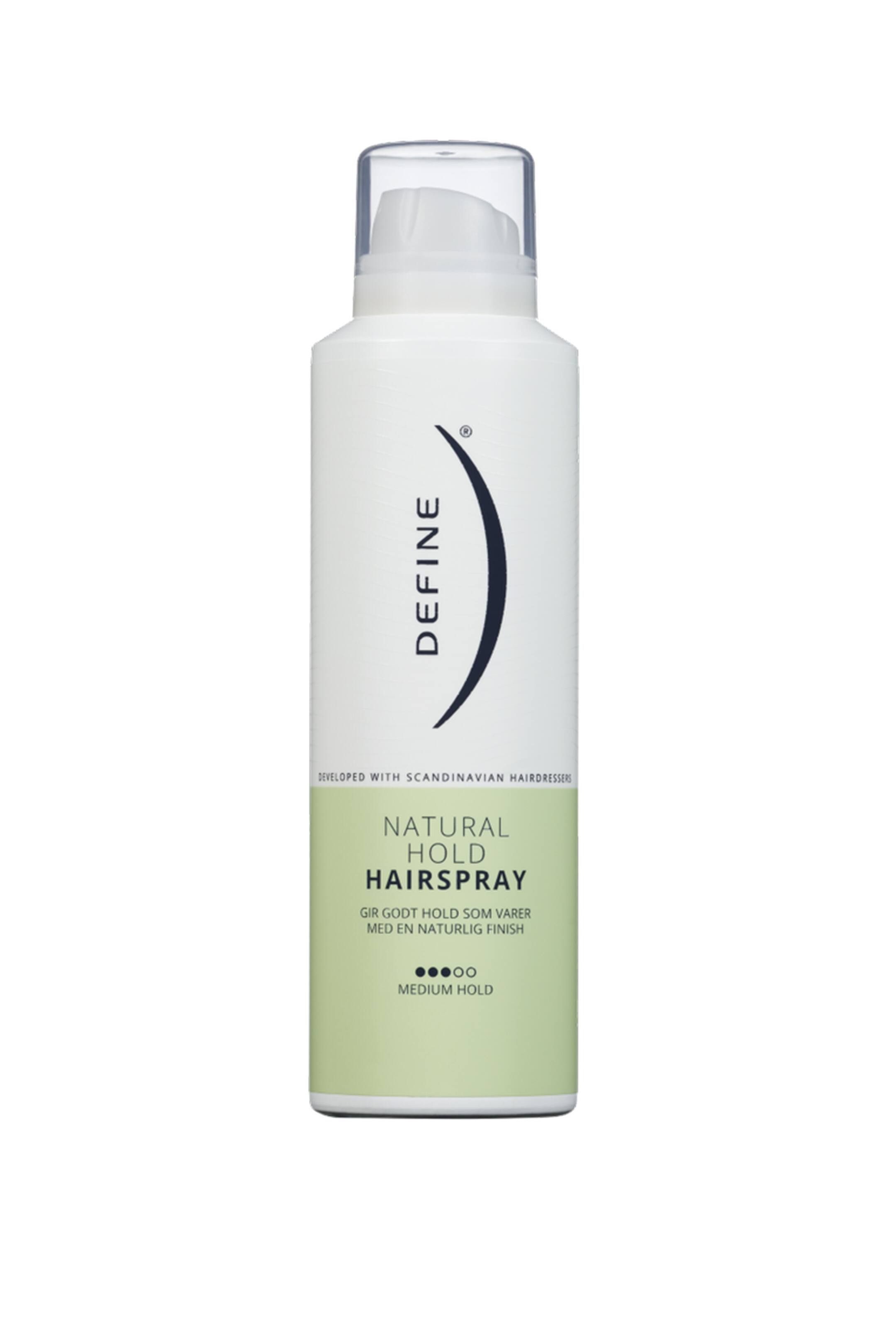 Define Natural Hold Hairspray gir en naturlig look og hold uten at håret føles stivt. Den motvirker frizz, gir glansfullt hår og er enkel å børste ut. Perfekt avslutning på en styling for et naturlig resultat. Vegansk. Produktet er utviklet i samarbeid med norske frisører.