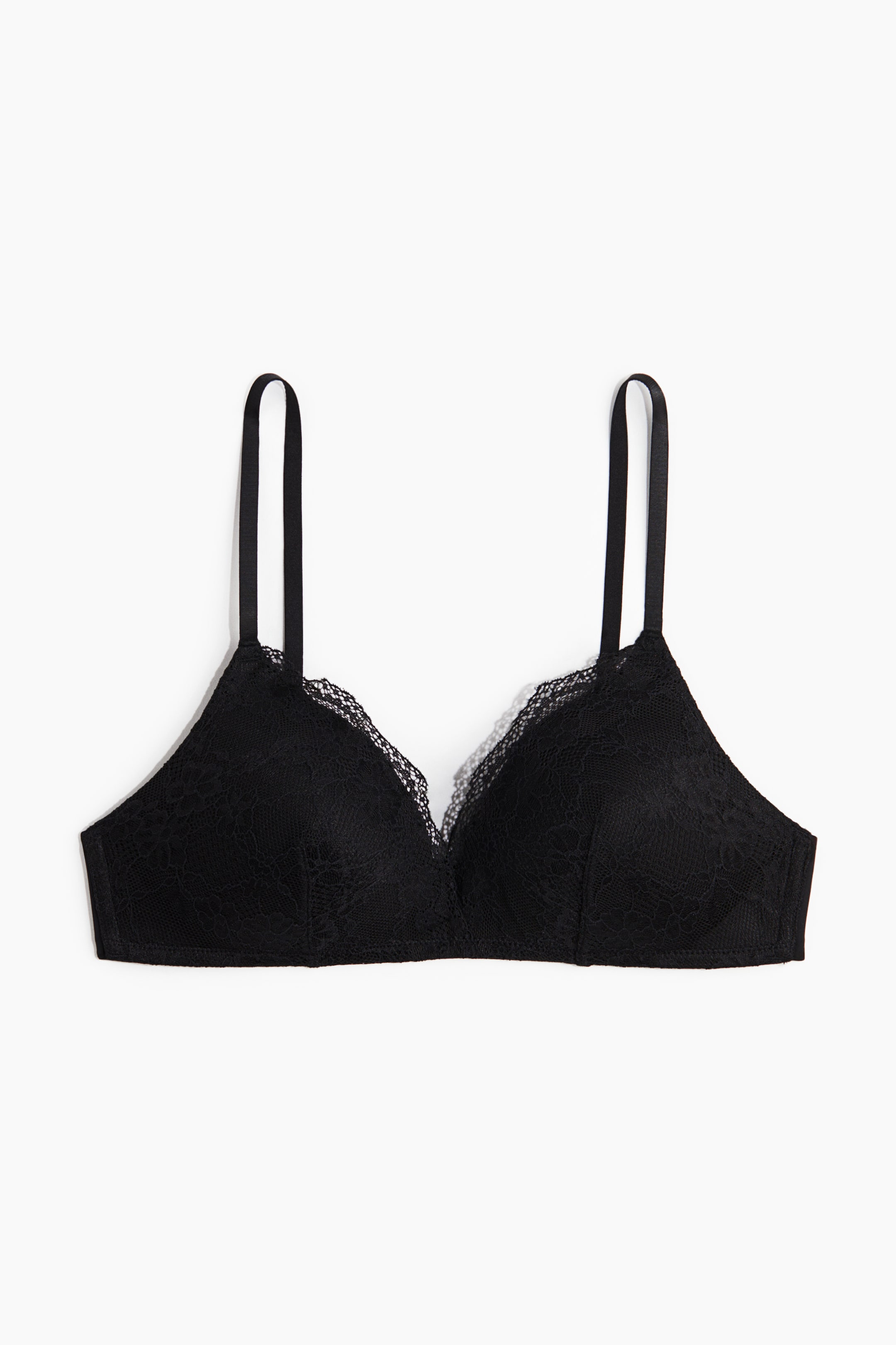 En myk, spileløs BH i blonde med regulerbare skulderbånd og vatterte skåler med bølgekant som former bysten og gir god støtte. Lukkes bak med hekter.