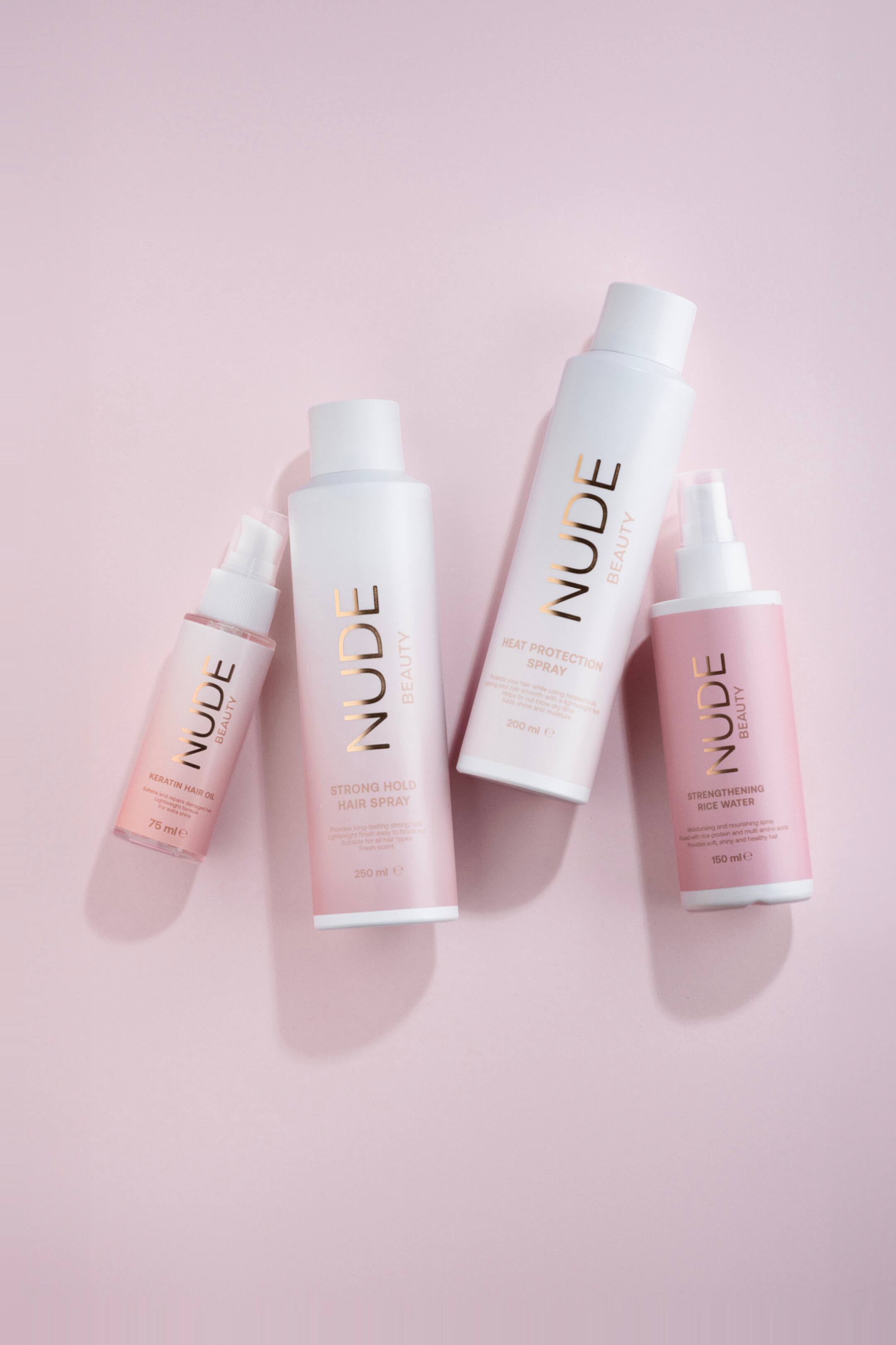 Nude Beauty varmebeskyttende spray beskytter håret mot skade fra varmeverktøy samtidig som den gir hold. Etterlater håret mykt og lettvektig, og tilfører glans og fukt.