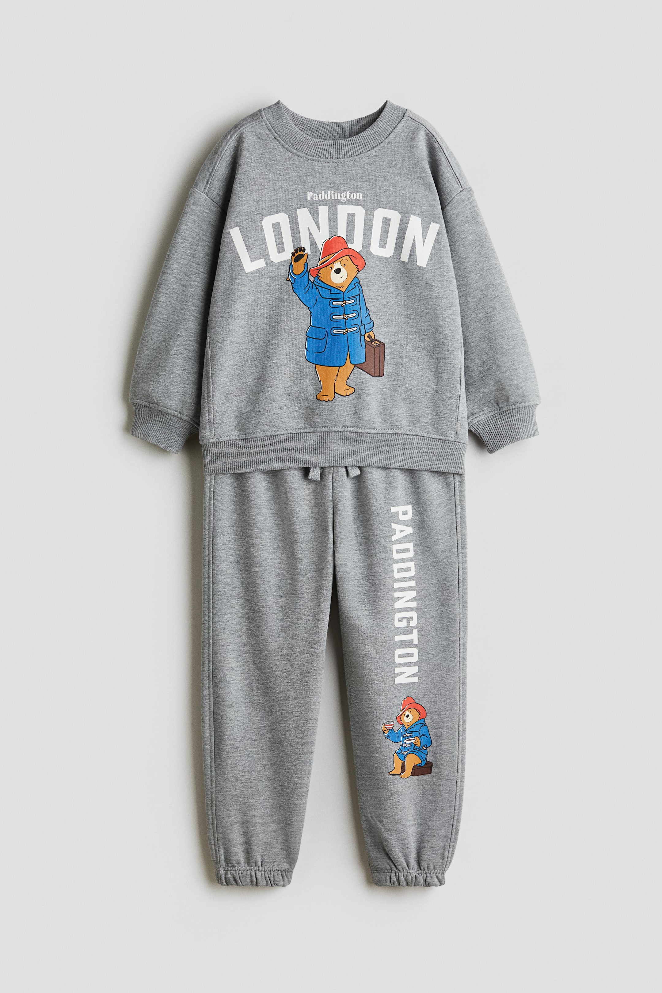 Et sett med topp og joggers i myk kvalitet med myk, børstet innside og trykte motiver. Langermet genser med rund, ribbestrikket hals, lav og lett fremovervendt skuldersøm, og ribbestrikket kant nederst og på ermene. Joggers med elastikk og snøring i midjen og trukket elastikk nederst på bena.