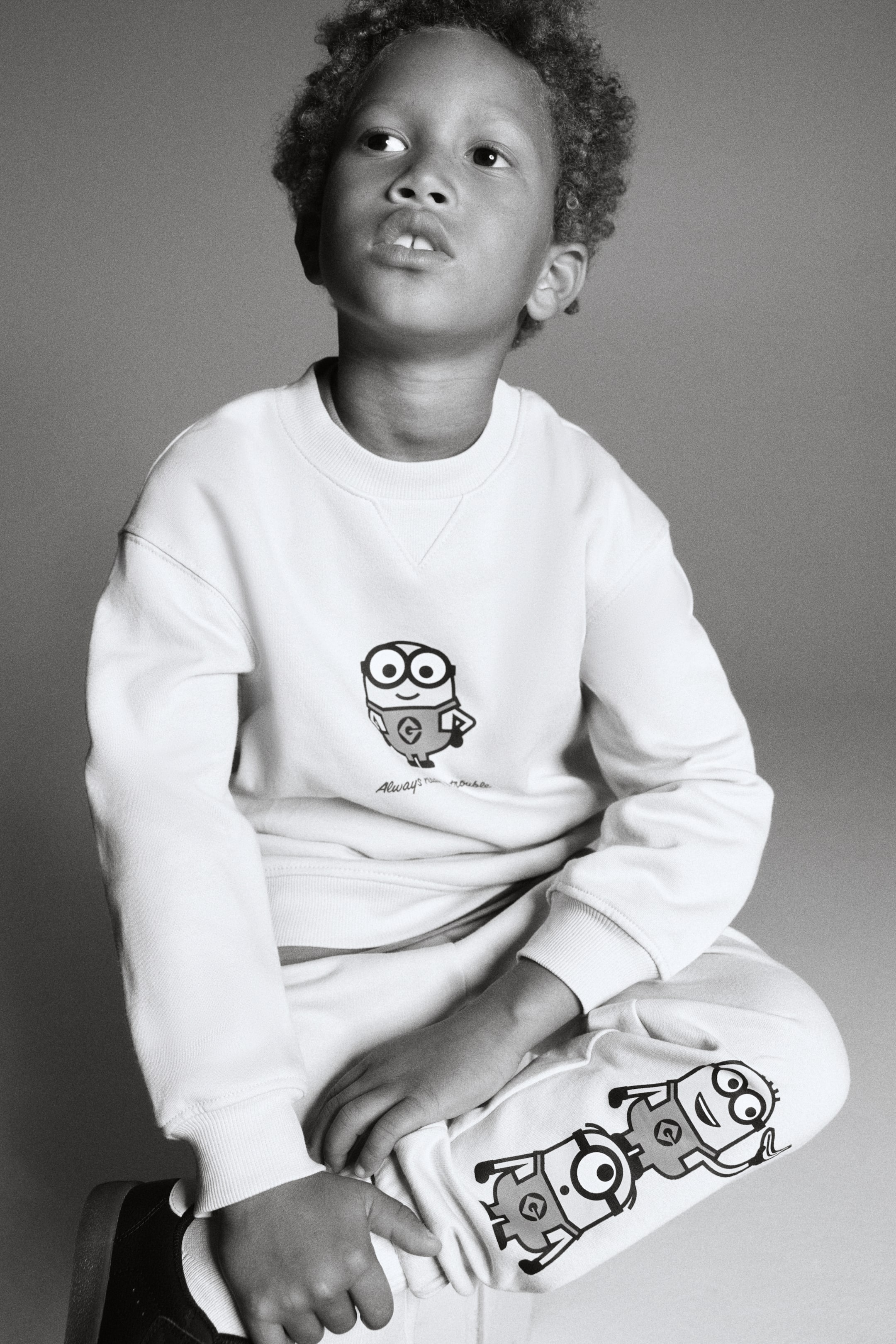 Et sett med topp og joggers i myk kvalitet med myk, børstet innside og trykte motiver. Langermet topp med rund, ribbestrikket hals, lav skuldersøm og ribbestrikket kant nederst og på ermene. Joggers med elastikk og snøring i midjen og trukket elastikk nederst på bena.