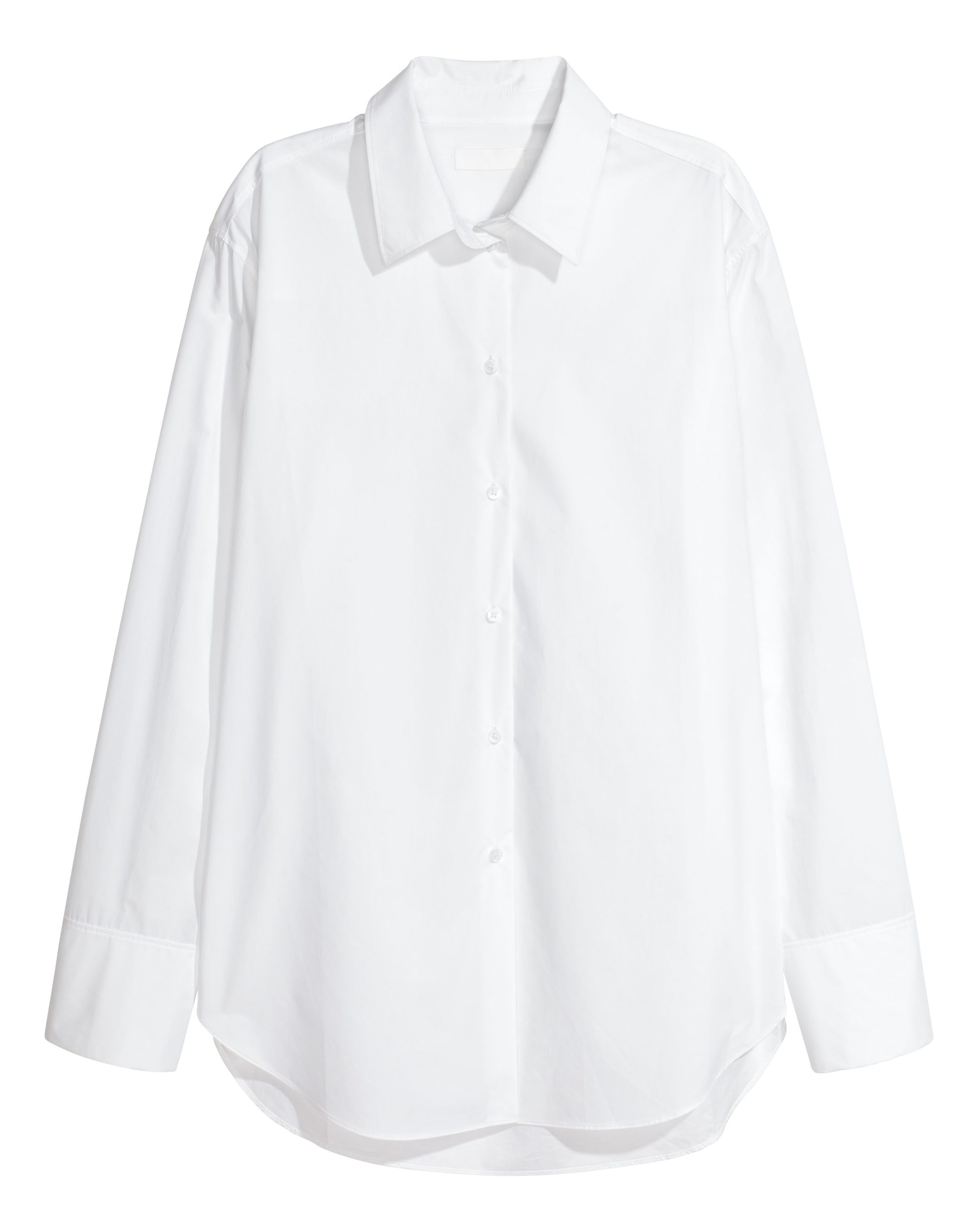 Cienka, popelinowa koszula z bawełny pima. Kołnierzyk, guziki z przodu. Długie rękawy z szerokim mankietem na guzik, z tyłu karczek z kontrafałdą. Lekko zaokrąglony dół i nieco dłuższy tył.