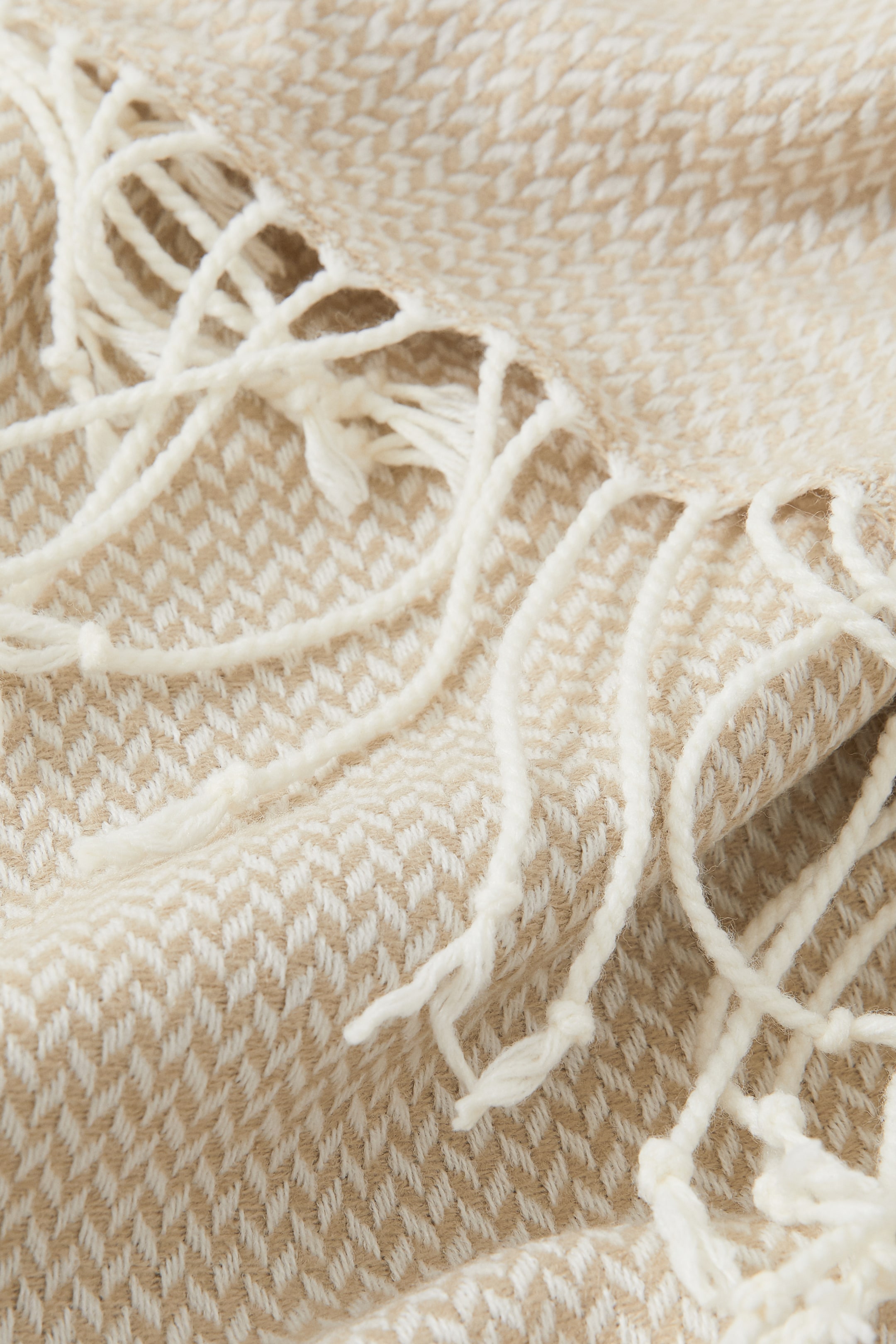Koc z miękkiej żakardowej tkaniny z frędzlami na krótkich bokach.