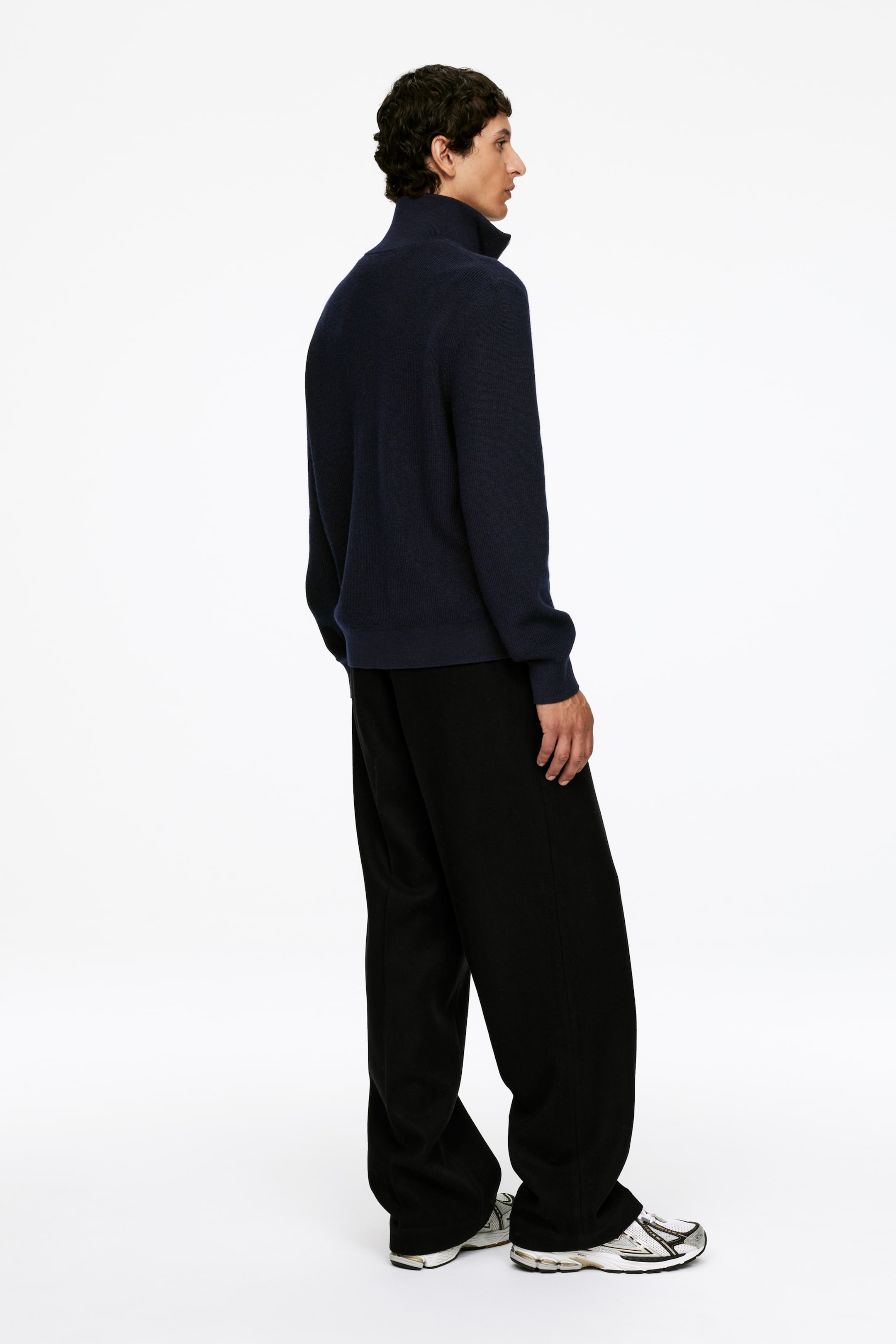 Sweter z nieco sztywnej w dotyku mieszanki surowej wełny i bawełny. Z czasem włókna będą stawać się gładsze i bardziej elastyczne, przez co dzianina będzie mięknąć. Sweter został wykonany ściegiem półpatentowym. Wysoki kołnierz z zamkiem błyskawicznym do połowy. Prążkowane wykończenia.