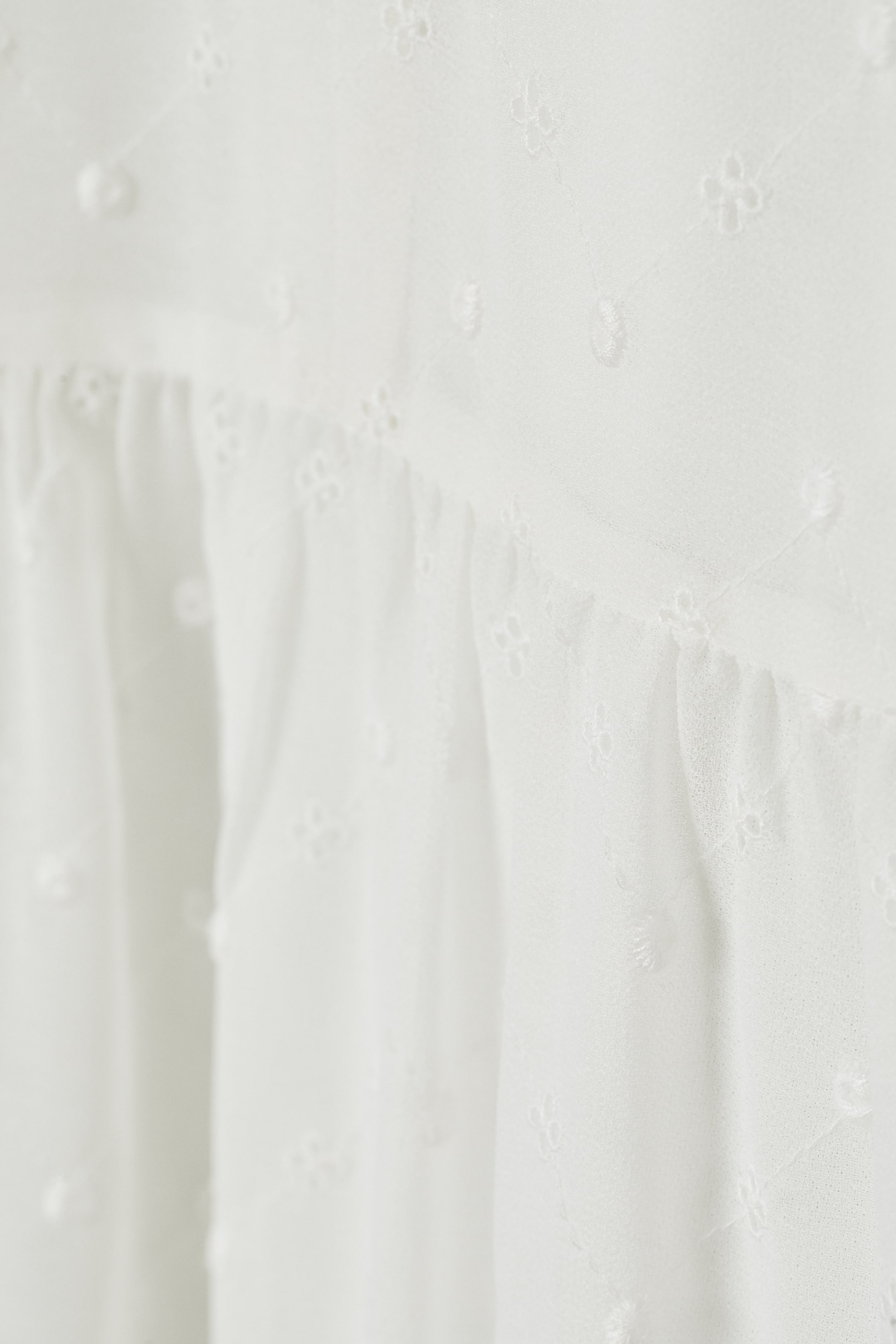 Krótka szyfonowa sukienka z haftem angielskim. Krótki falbankowy kołnierzyk z wiązaniem z przodu i rozcięcie w serek. Marszczenie na ramionach, długie bufiaste rękawy zakończone szerokim mankietem z obciąganymi guzikami. Marszczone odcięcie w talii i falbana dołu. Z dżersejową podszewką.