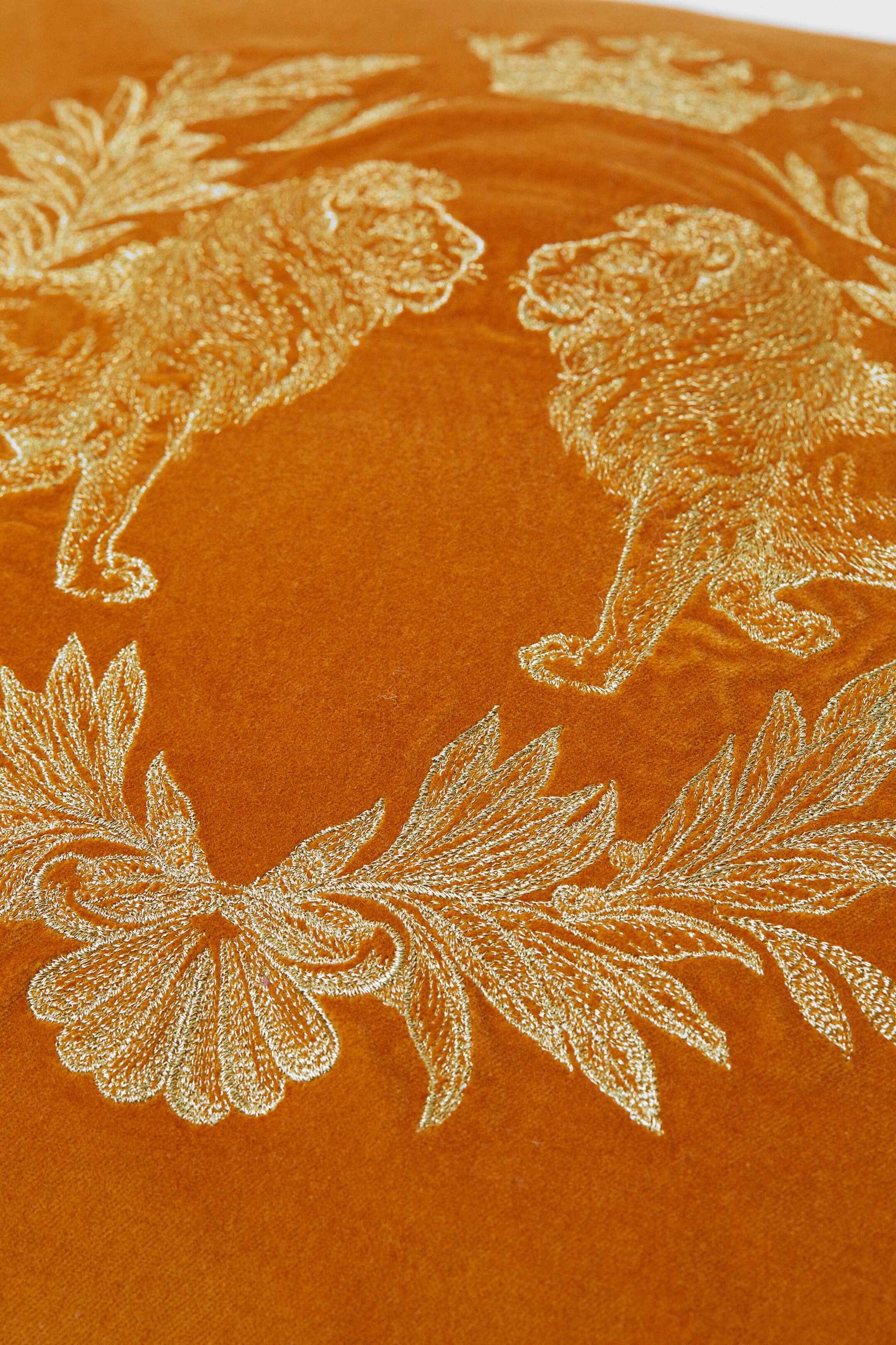 Poszewka na poduszkę z bawełnianego aksamitu ze złocistym haftowanym motywem. Skręcone wypustki i frędzle na rogach. Kryty suwak wzdłuż jednego boku.