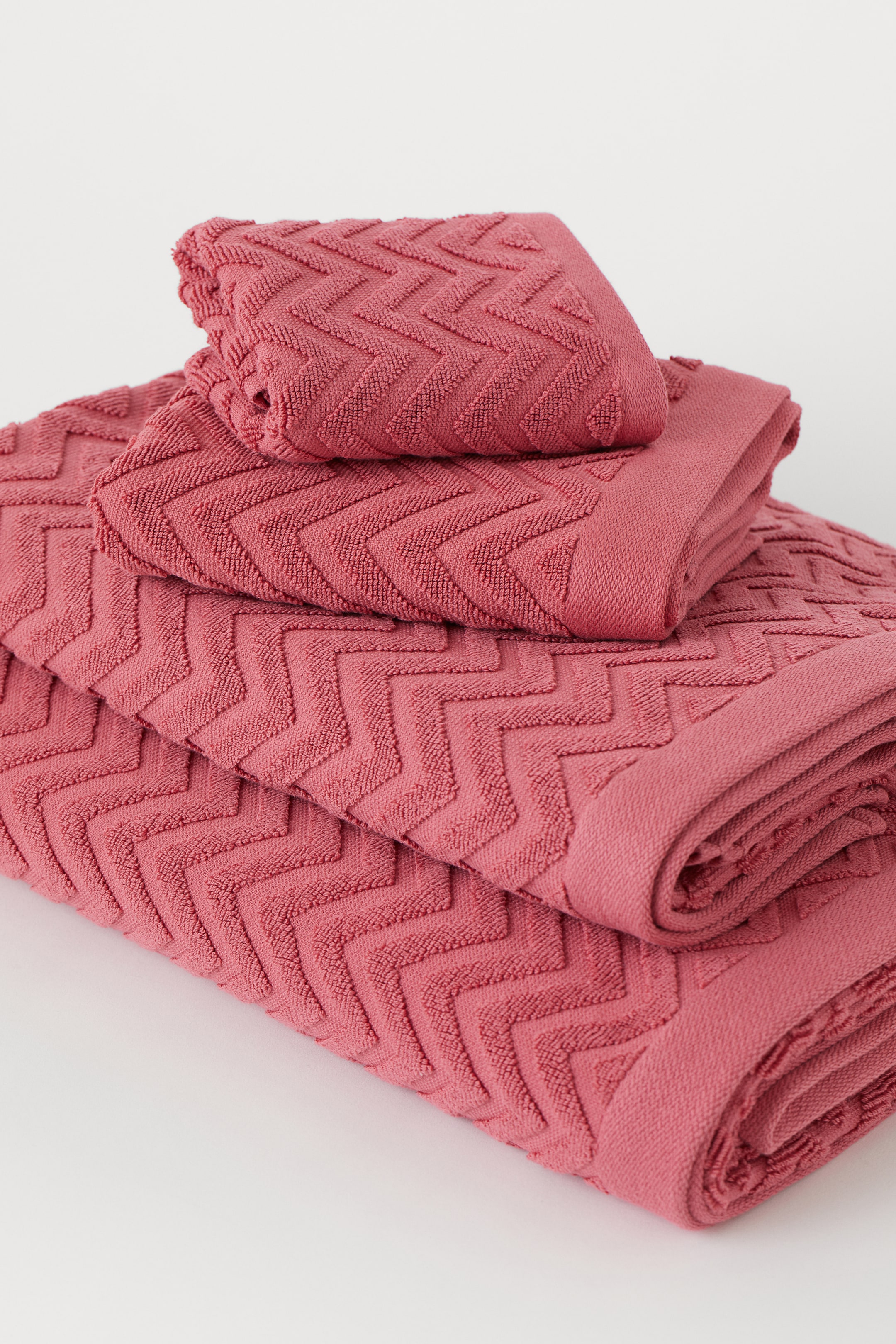 Ręcznik kąpielowy z bawełnianej frotte w żakardowe zygzaki. Zawieszki na krótszych bokach. Seria składa się z ręczników o różnych wymiarach.