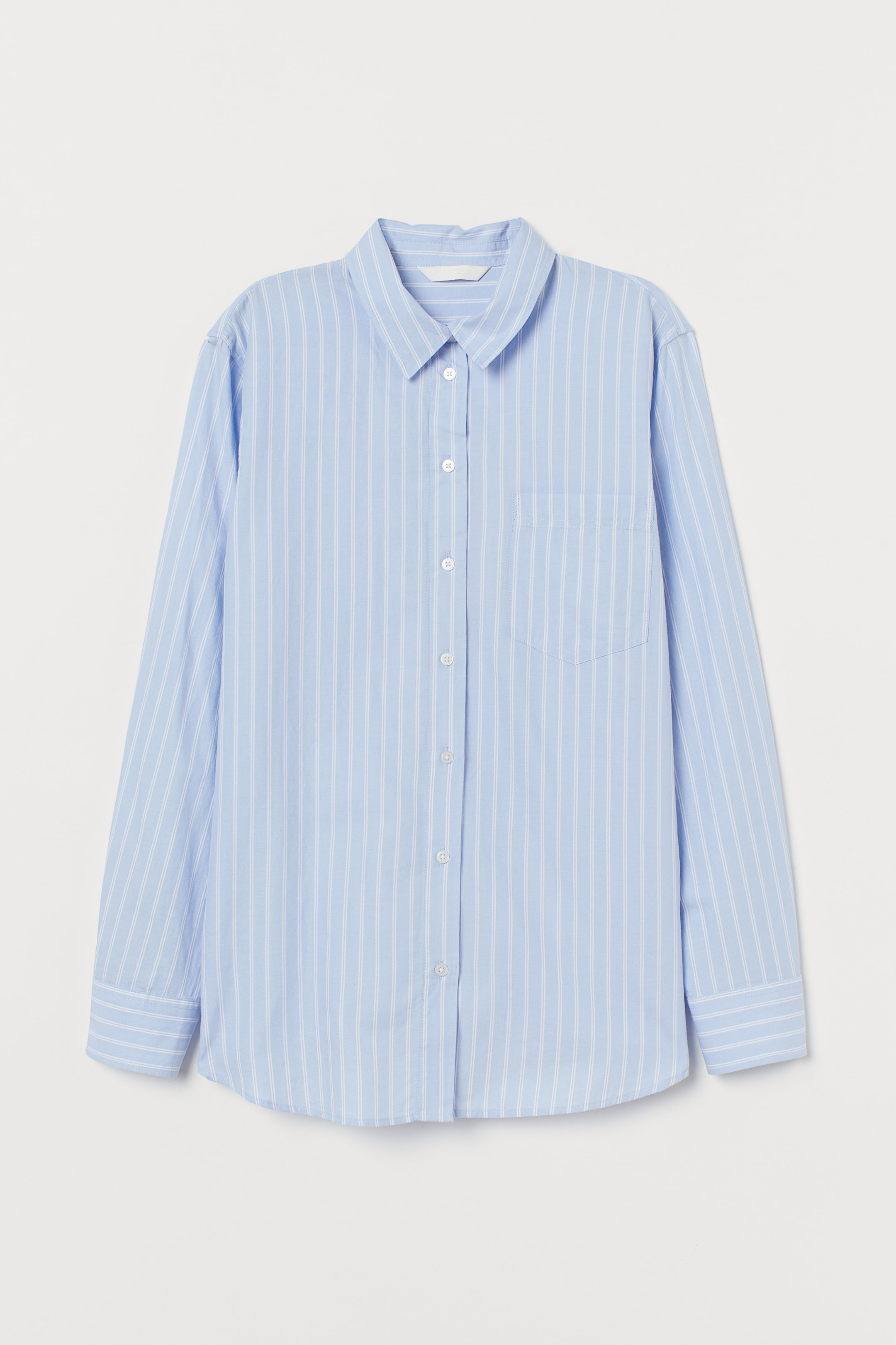 Koszula z bawełnianej tkaniny o swobodnym fasonie. Kołnierzyk, guziki z przodu, kieszonka na piersi. Z tyłu karczek z kontrafałdą. Długie rękawy z zapinanym mankietem. Zaokrąglony dół.