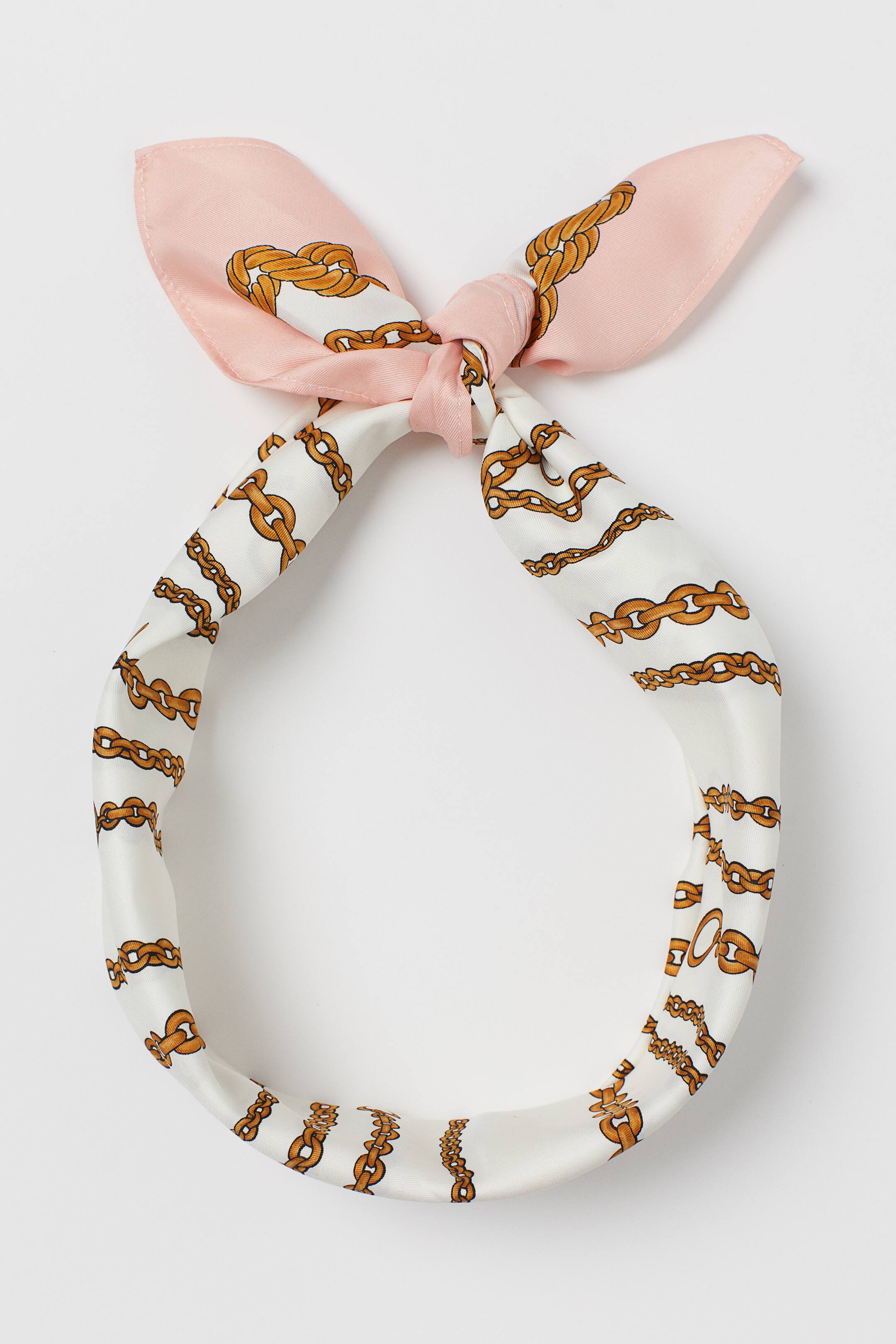 Satynowa chustka we wzorzyste nadruki do noszenia także jako opaska do włosów. Wymiary 55x55 cm. Poliester zawarty w produkcie pochodzi częściowo z recyklingu.
