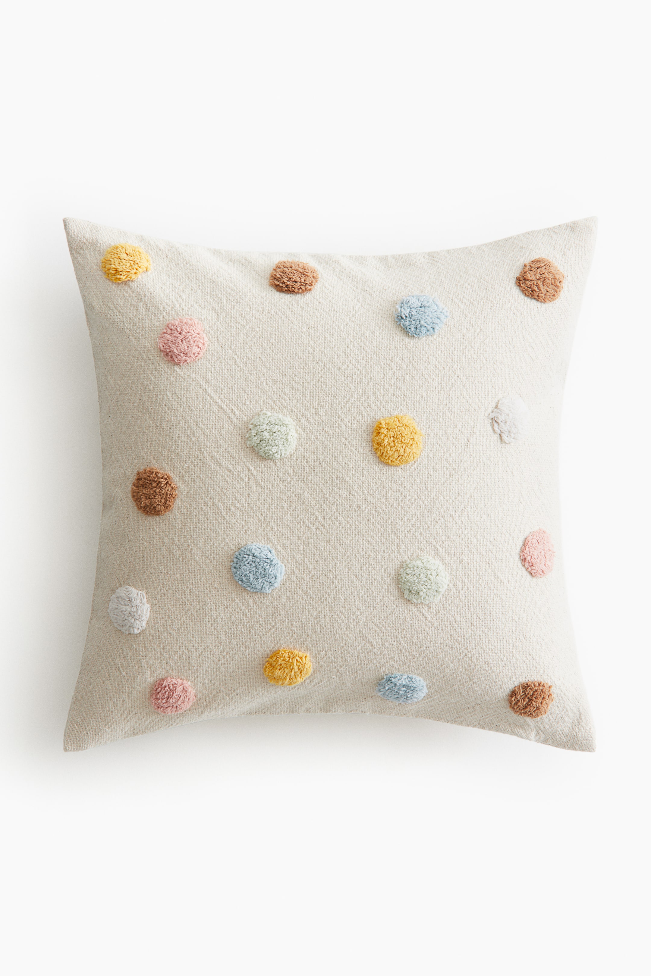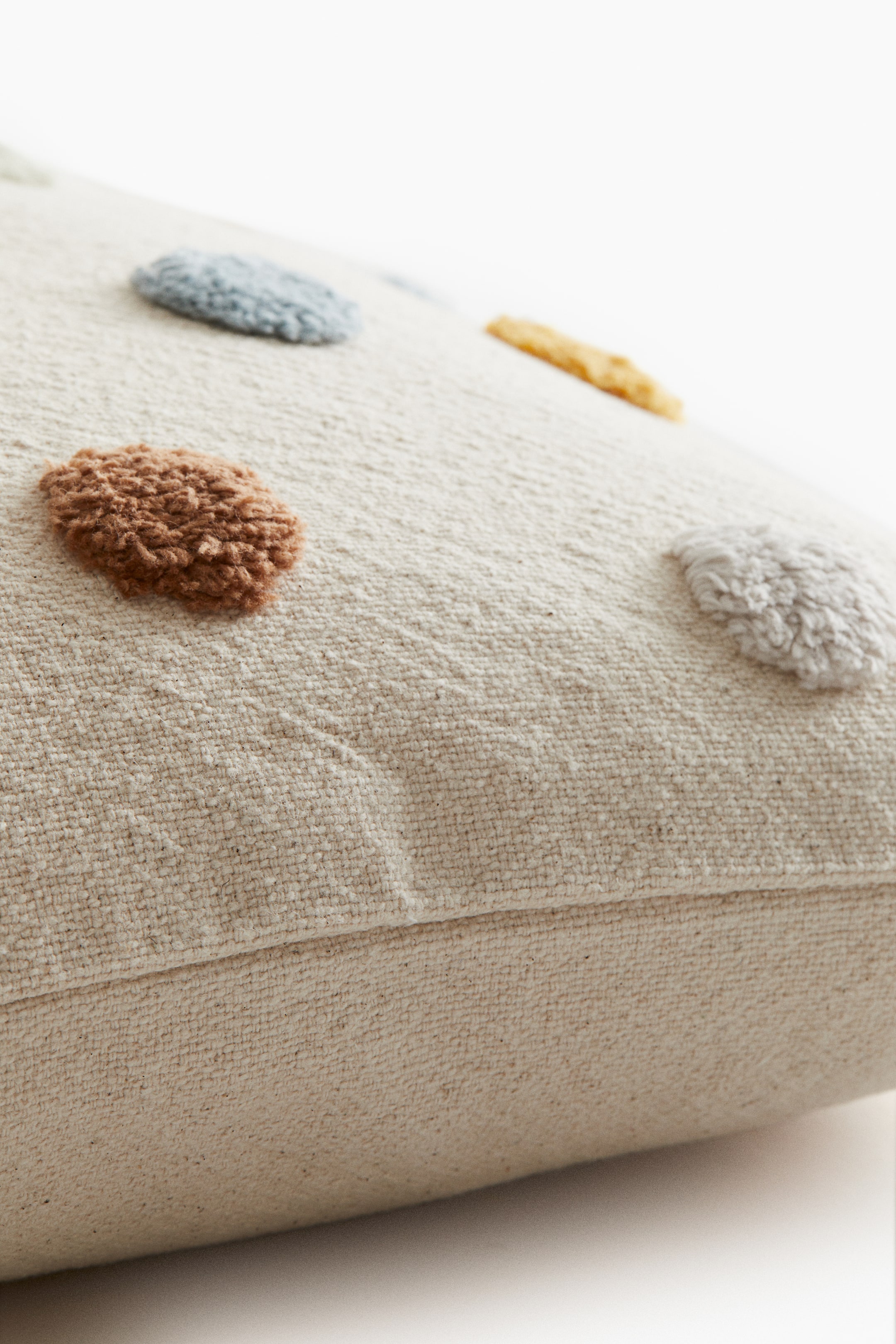 Poszewka na poduszkę wykonana z bawełnianej tkaniny ecru z puszystym motywem z przodu. Jednolity tył i suwak z boku.