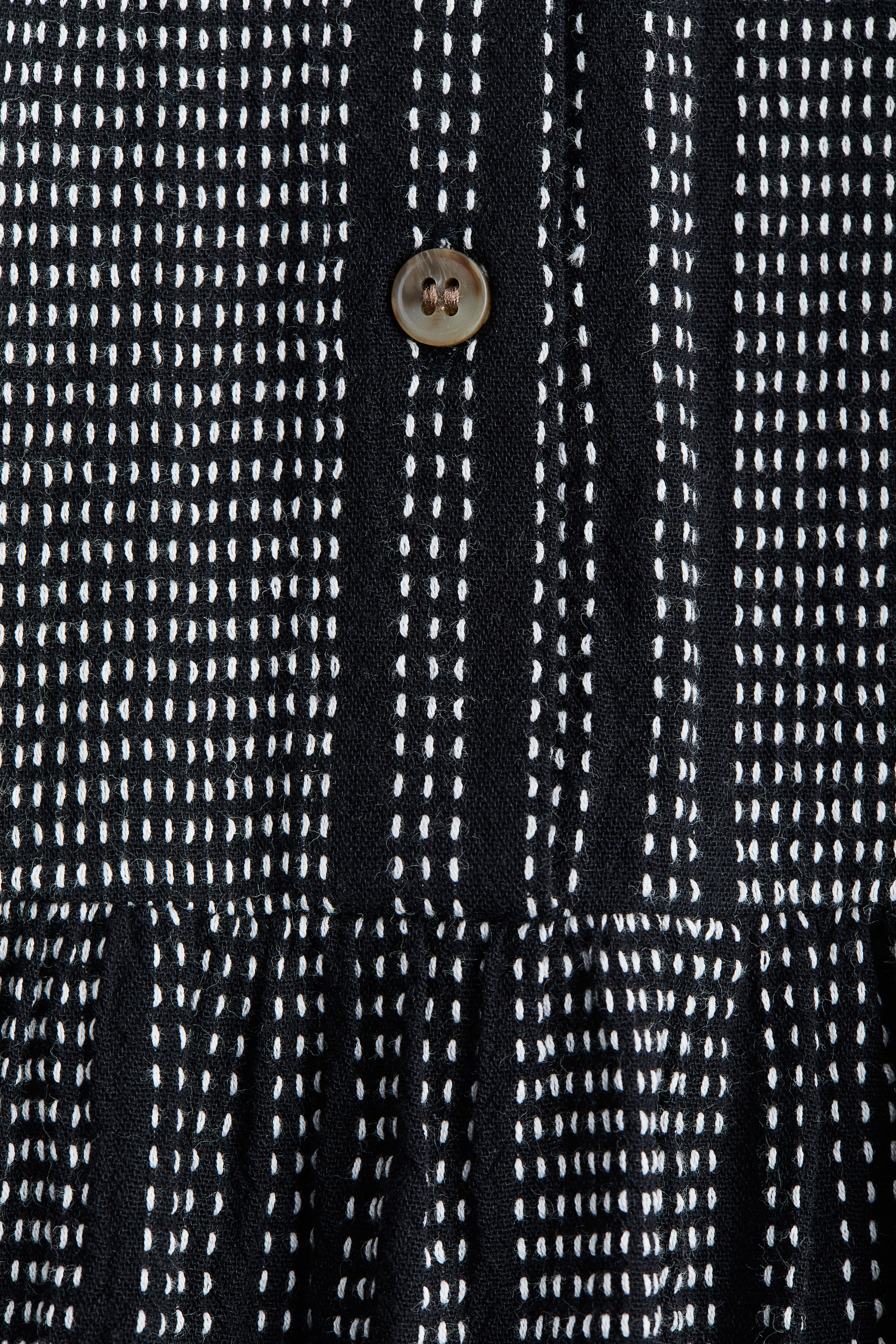 Krótka tkaninowa sukienka. Falbankowa stójka, guziki u góry. Luźny fason, lekko obniżone ramiona, długie baloniaste rękawy z elastycznym brzegiem i marszczone odcięcie na biodrach.