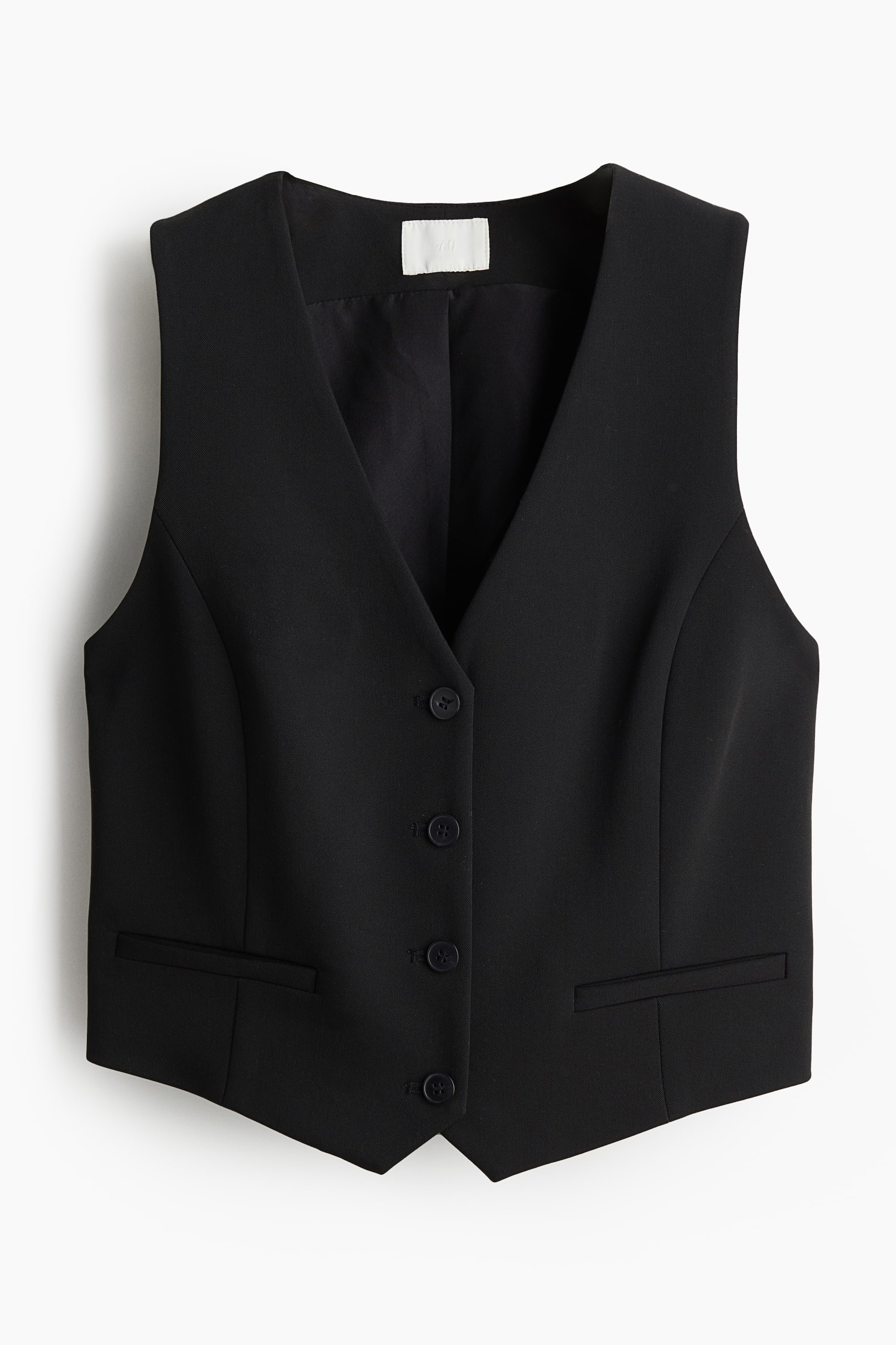 Podkreślająca figurę krótka kamizelka z tkaniny. Dekolt w serek, zapięcie na guziki, z przodu kieszenie z wypustką. Z przodu profilujące szwy podkreślające sylwetkę. Z podszewką.