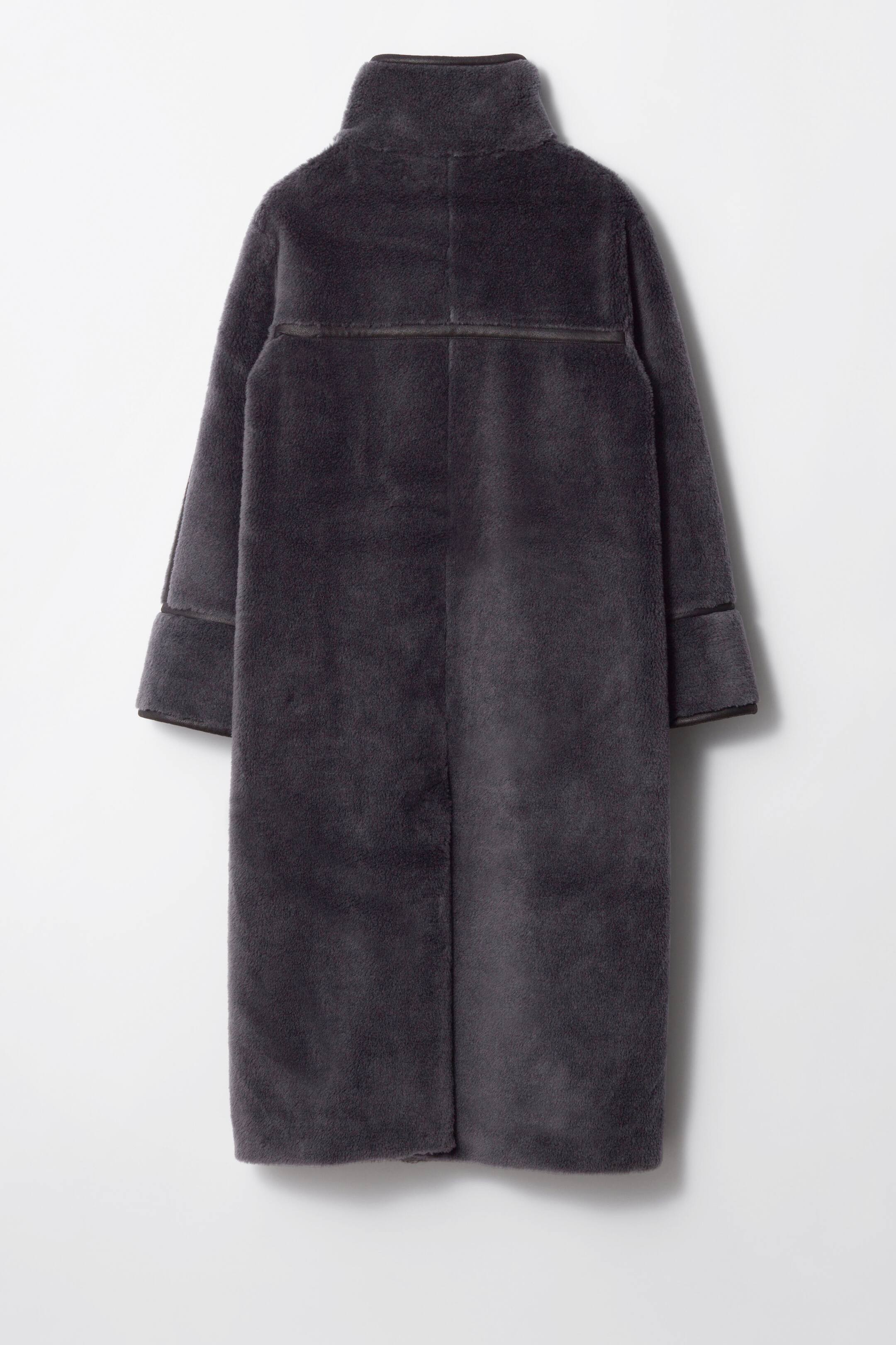 Średniej długości płaszcz ze sztucznego futra z szerokim i wysokim kołnierzem, kontrastowymi paskami oraz dwiema dyskretnymi kieszeniami z przodu. • Zapięcie na guziki z przodu • 85% wełna z certyfikatem RWS (TE-00047206) Długość: 120,5 cm (rozmiar S)