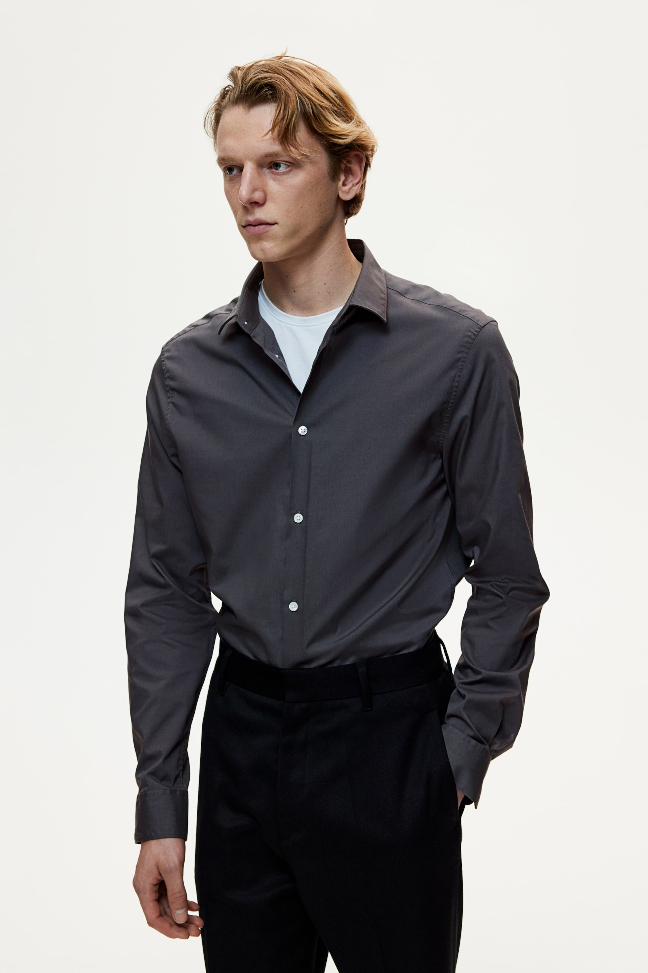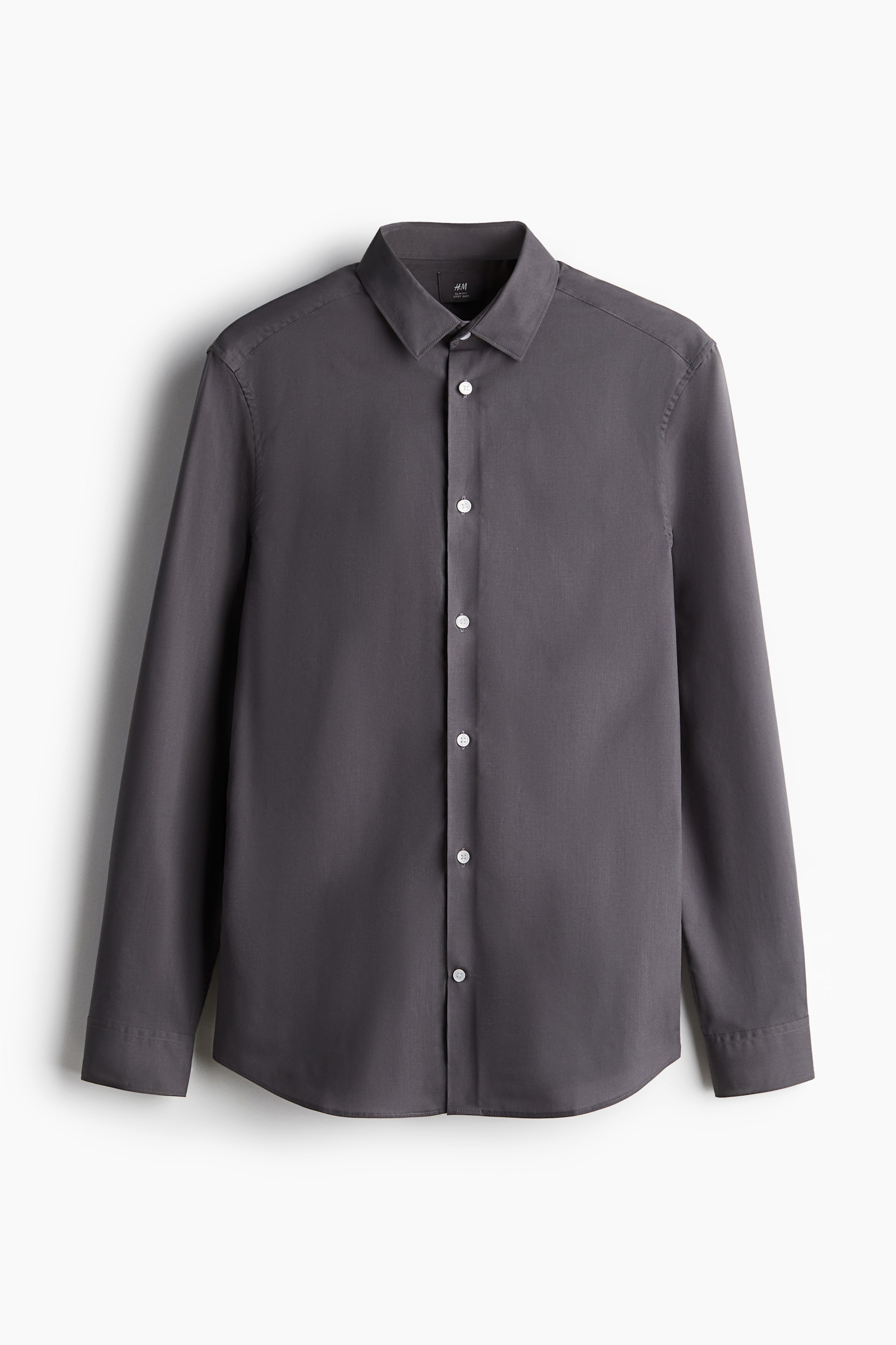 Koszula z tkaniny poddanej obróbce ułatwiającej prasowanie. Wykładany kołnierzyk, klasyczny przód, karczek z tyłu. Długie rękawy z rozcięciem i guzikiem zabezpieczającym zakończone mankietem z regulowanym zapięciem. Lekko zaokrąglony dół. Wąski fason o kroju dopasowanym do sylwetki.