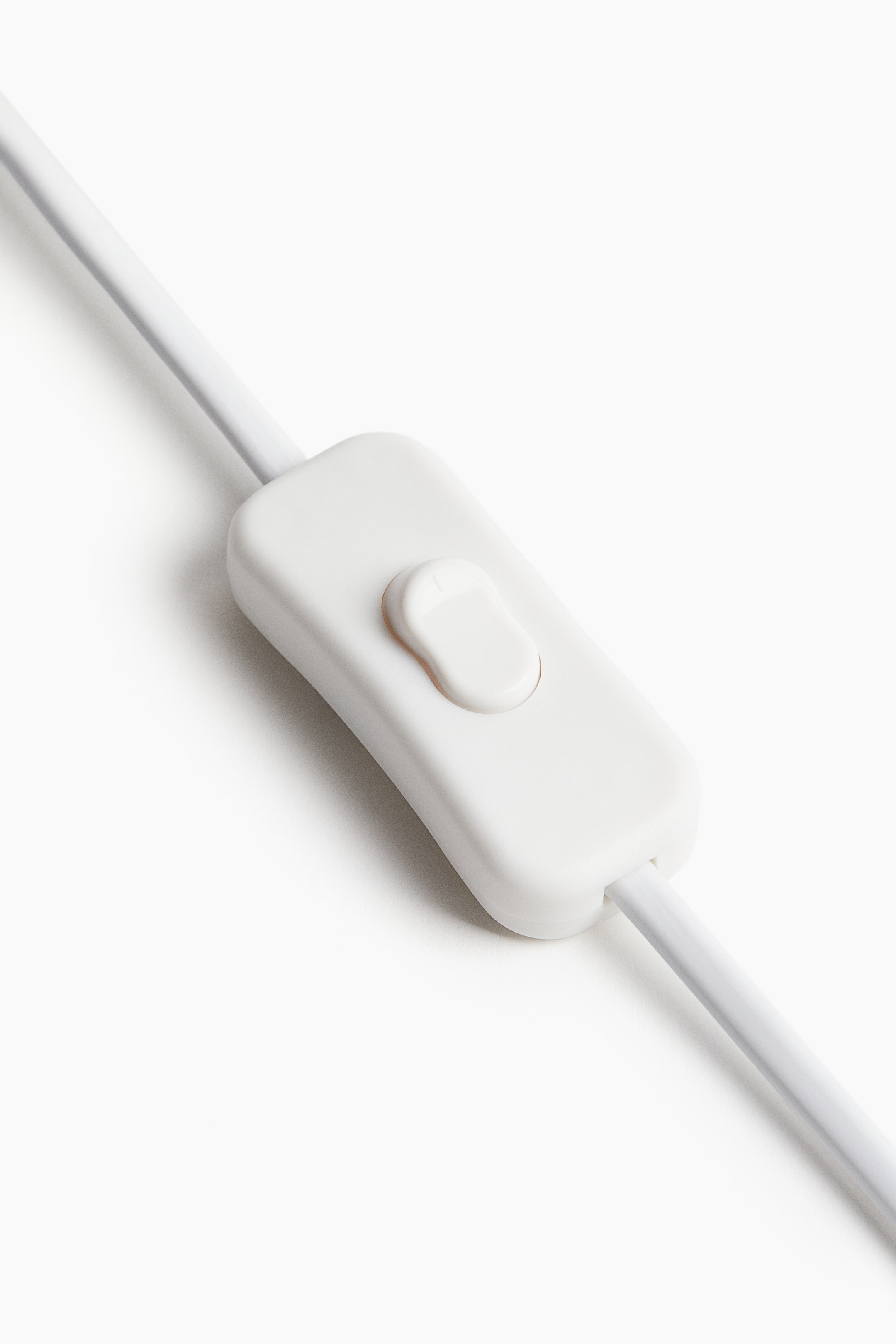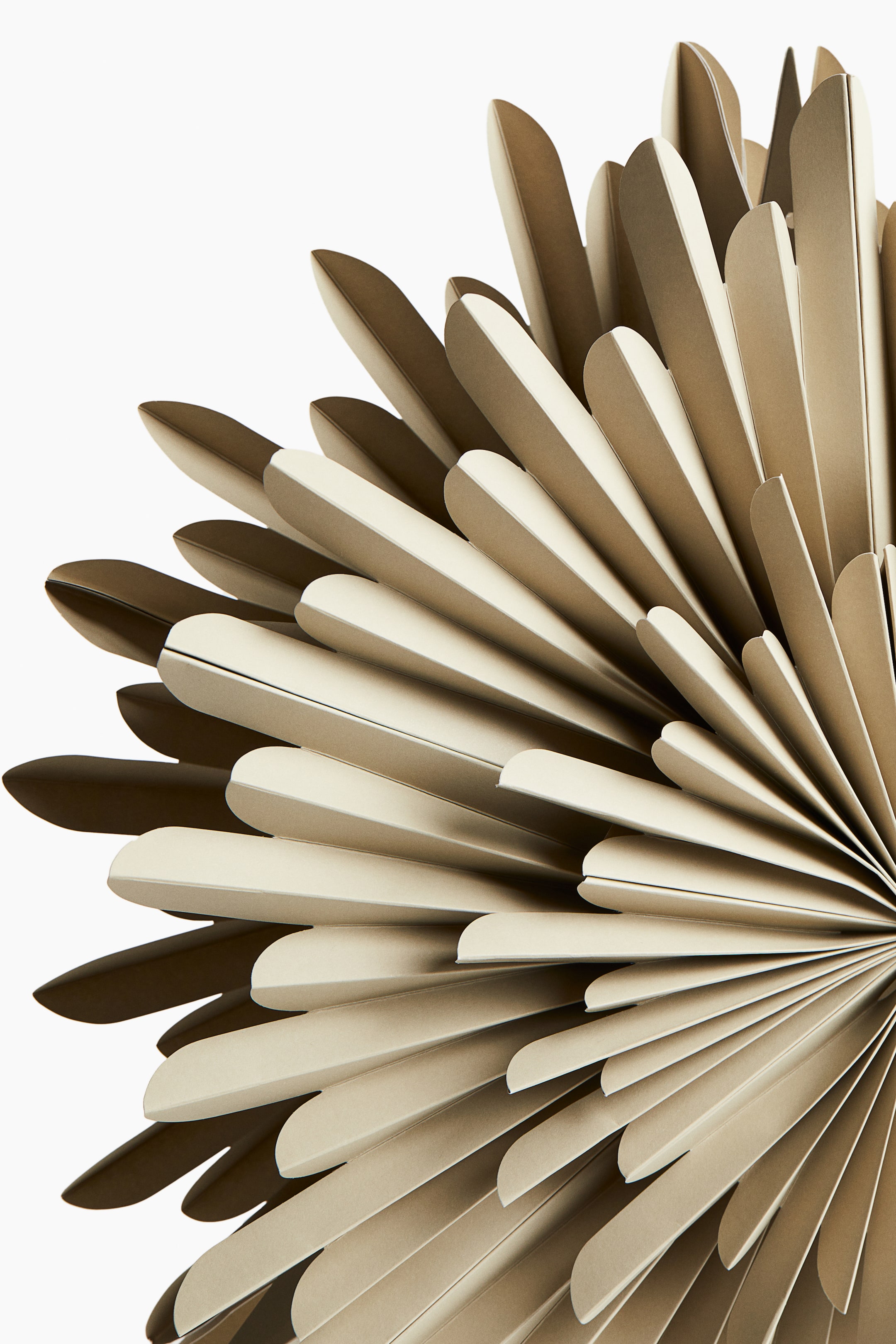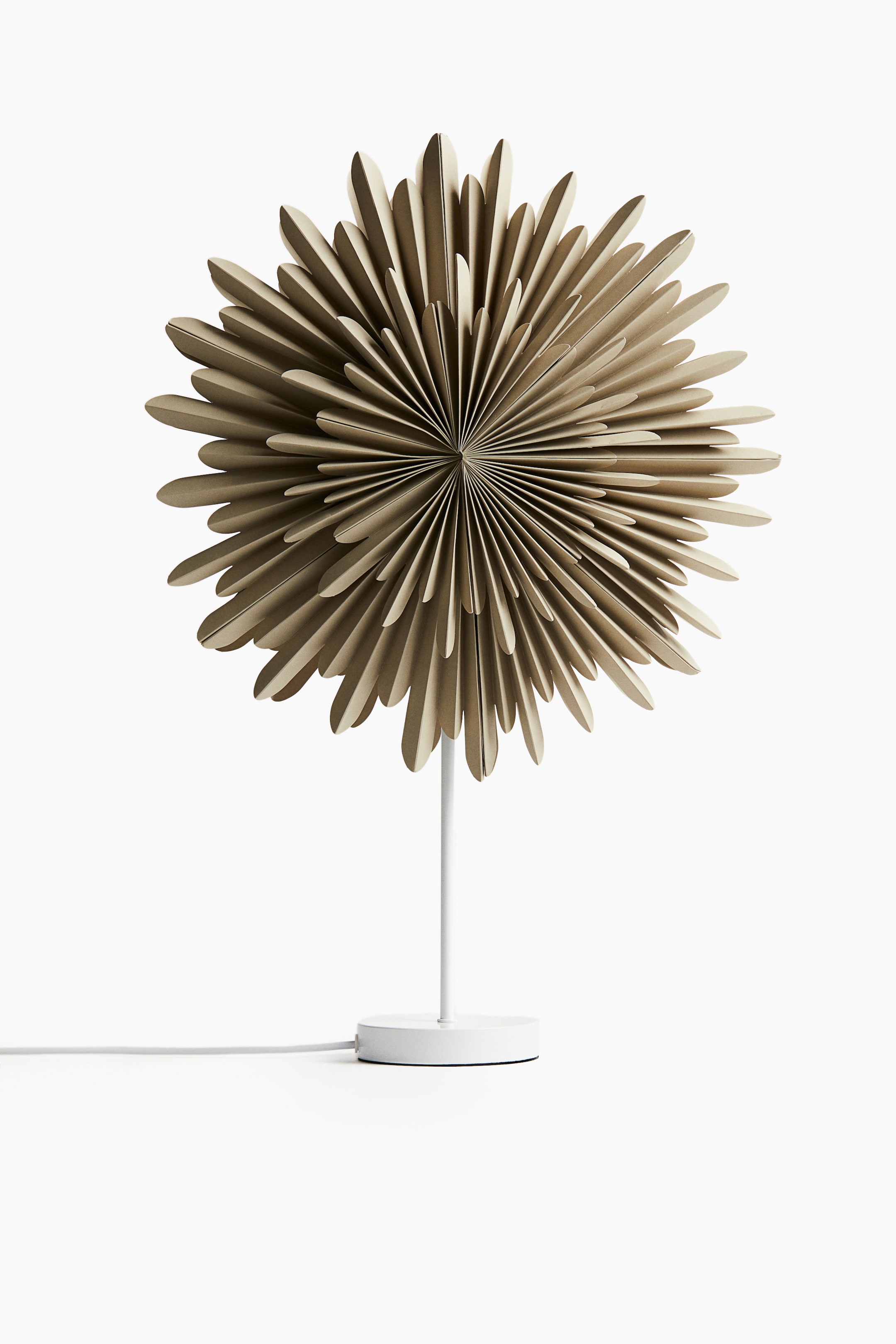 Lampa stołowa z metalową podstawą i z papierowym kloszem w kształcie gwiazdy. Plastikowy przewód z plastikowym przełącznikiem. Oprawka na żarówki E14. Maksymalna moc żarówki LED 6 W. Żarówka nie jest dołączona. Średnica klosza 45 cm. Wysokość całkowita 60 cm. Długość przewodu 160 cm.