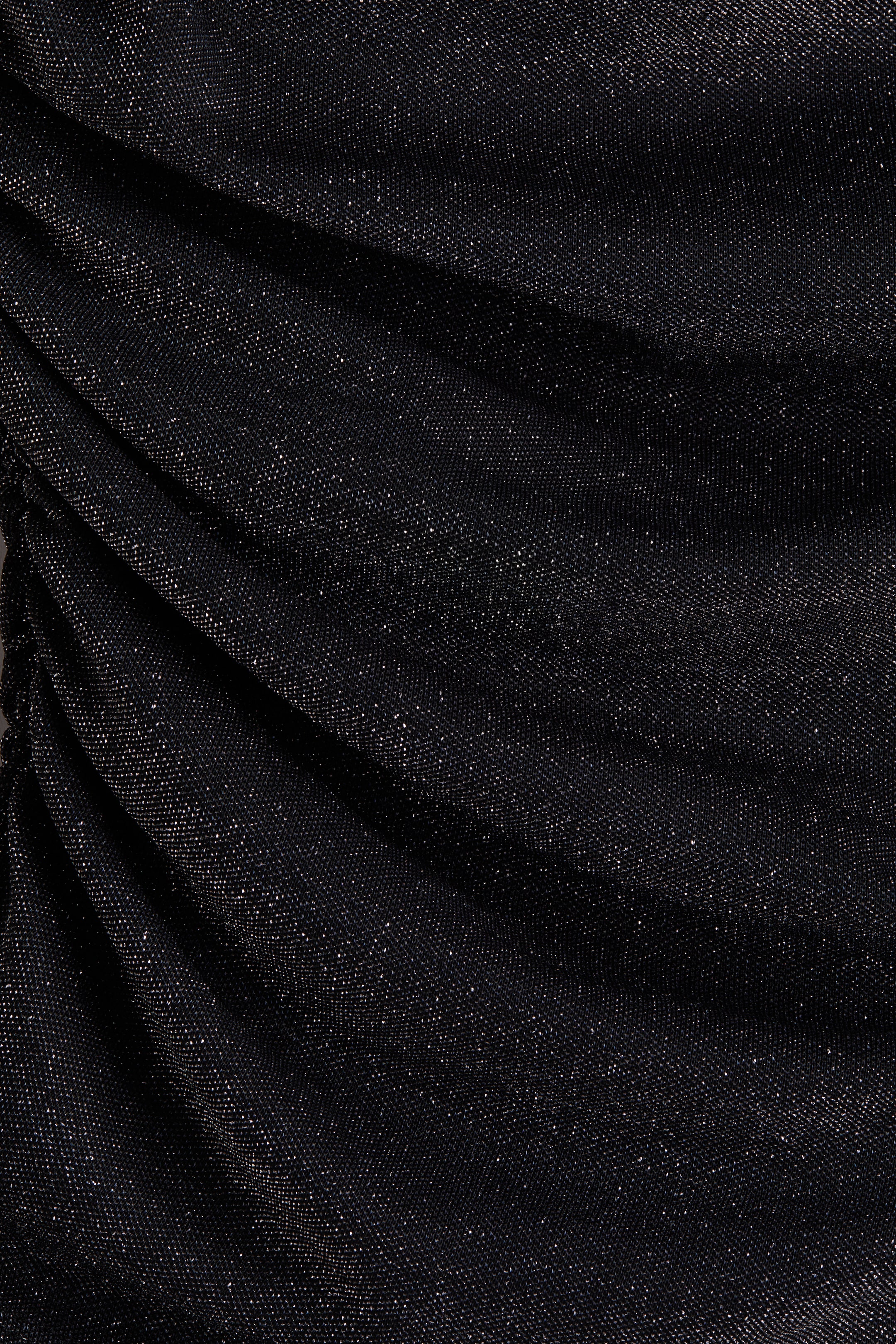 Podkreślający figurę krótki top z błyszczącego dżerseju. Marszczone szwy boczne tworzą efekt drapowania. Dekolt karo, bardzo wąskie elastyczne ramiączka. Z podszewką.