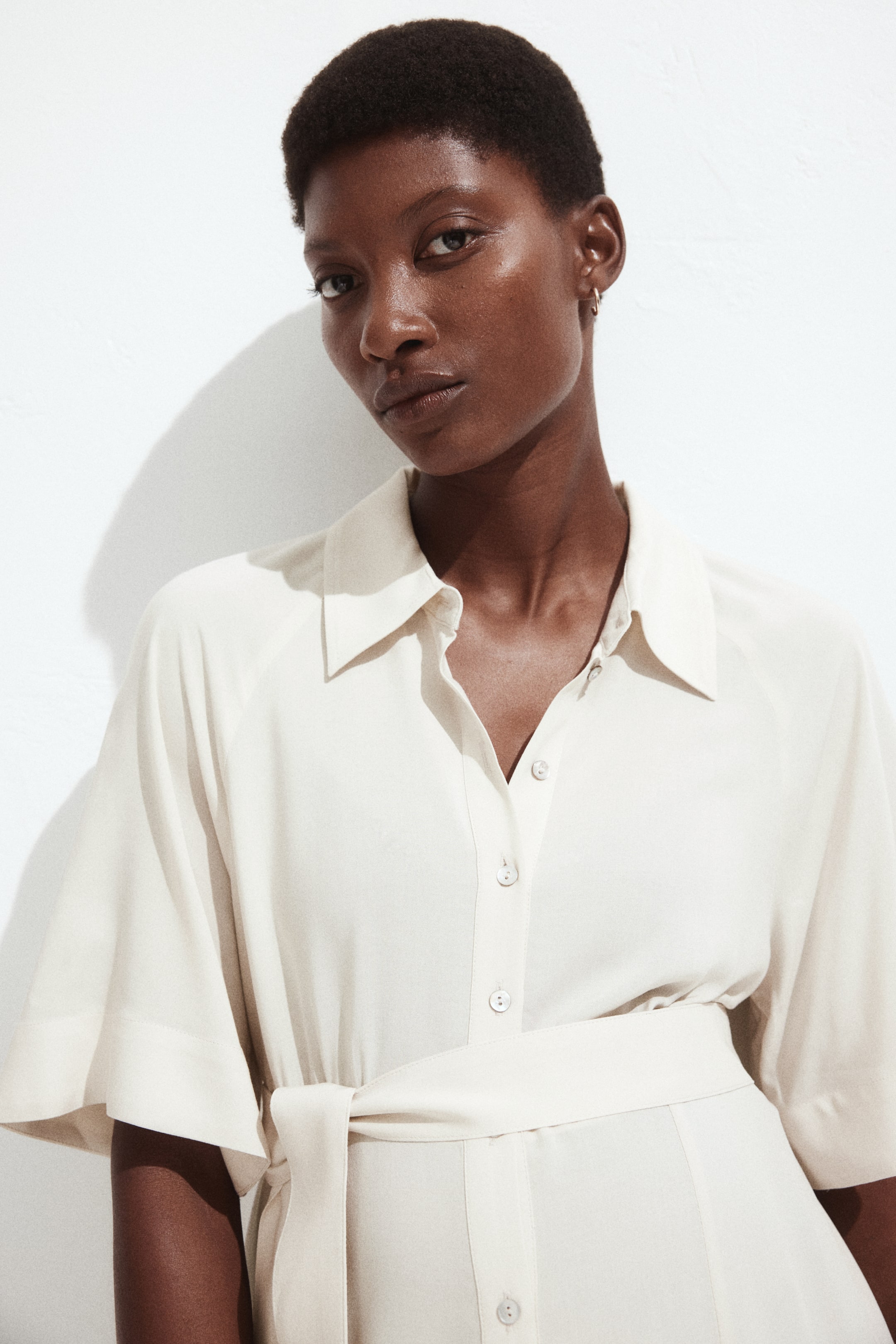 Sukienka do połowy łydki wykonana z wiskozowej tkaniny. Kołnierzyk, zapięcie na guziki i reglanowe rękawy do łokcia. Elastyczny tył talii i wyjmowany szeroki pasek do wiązania. Sukienkę można nosić zarówno podczas ciąży, jak i po niej. Bez podszewki.