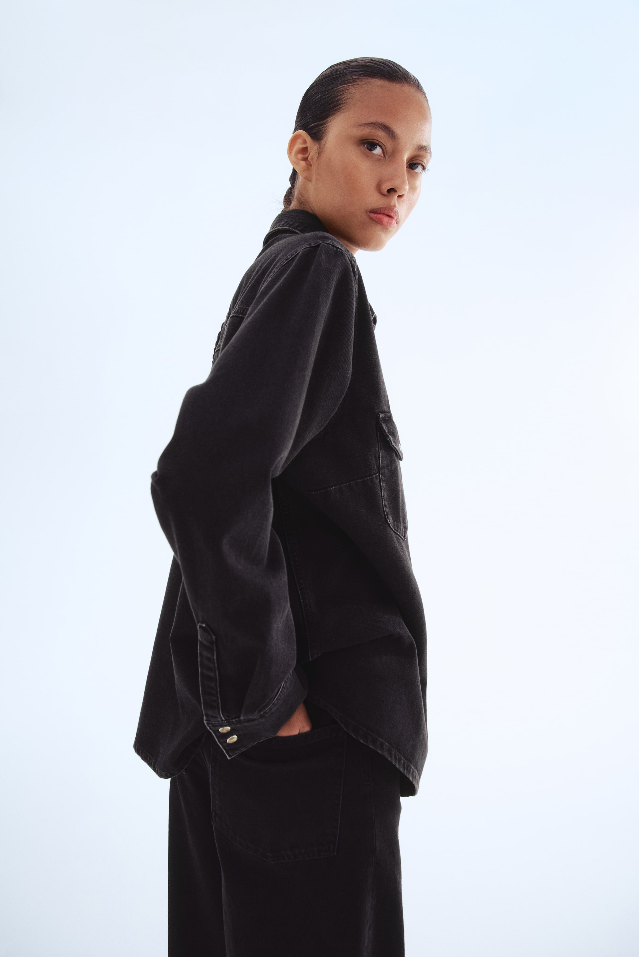Koszula z miękkiego leciutkiego denimu. Kołnierzyk, zapięcie na zatrzaski, z tyłu karczek. Na piersi kieszenie z klapką i zatrzaskiem. Długie rękawy z zatrzaskiem na mankietach.