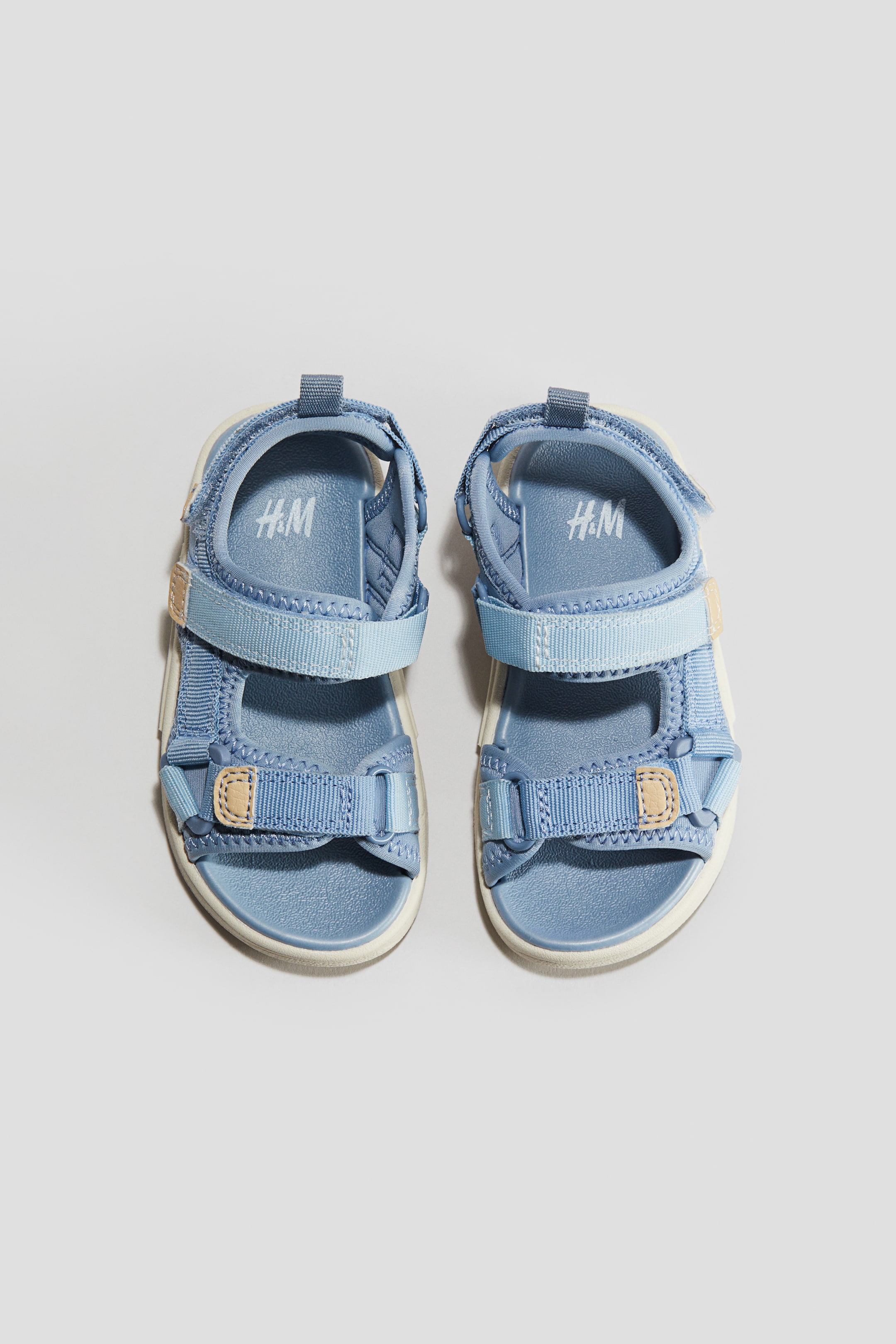 Sandały z pianki scuba z regulowanymi rypsowymi paskami z przodu i wokół pięty zapinanymi na rzepy. Profilowane podeszwy wewnętrzne i karbowane podeszwy zewnętrzne.