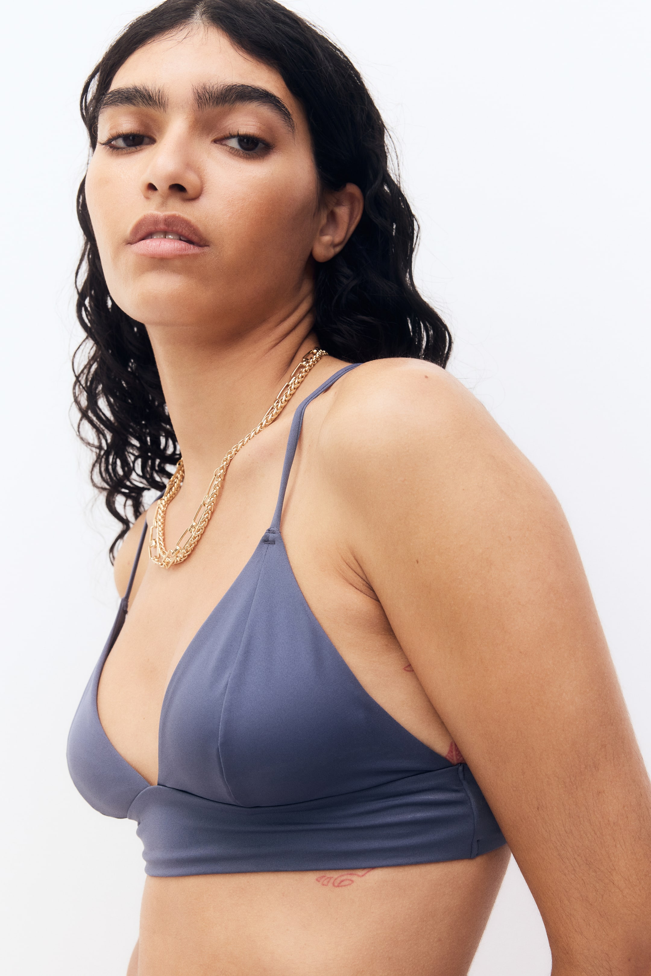 Biustonosz bikini bez fiszbinów. Wąskie regulowane ramiączka skrzyżowane i wiązanie z tyłu. Z podszewką. Trójkątne miseczki z wyjmowanymi wkładkami dobrze podtrzymują biust i nadają mu kształt. Bez zapięcia.