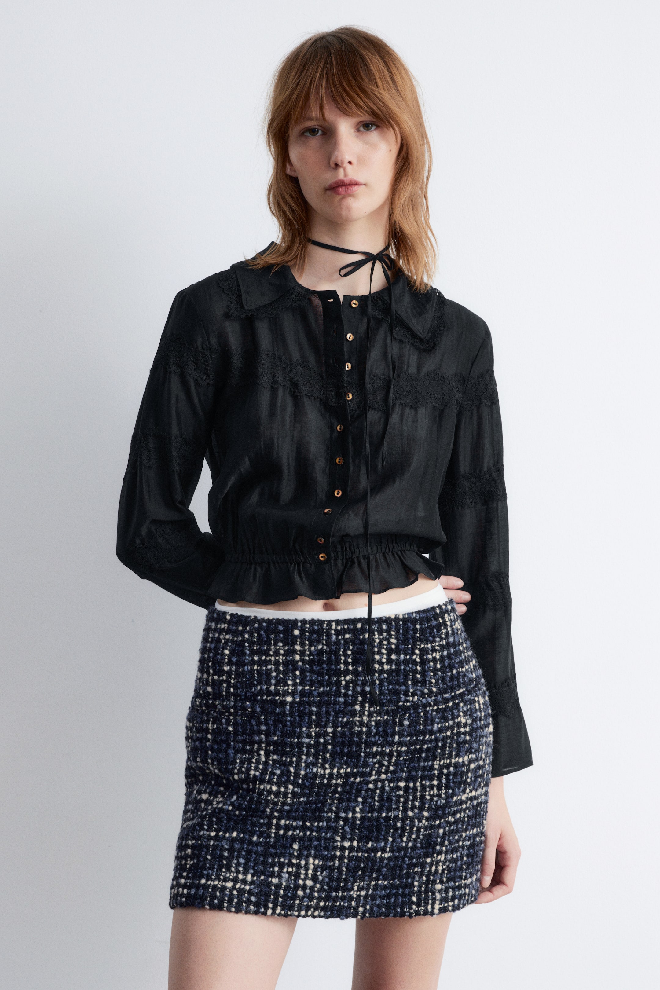 Bluzka wykonana z lekkiego, półprzezroczystego materiału z lśniącym wykończeniem. Długie rękawy, klasyczny kołnierzyk, koronkowe wykończenia, elastyczna talia tworząca efekt marszczenia i falbanka na dole. Zapięcie na guziki i delikatne wiązanie z przodu. Długość:47,5 cm (EU 36 / UK 8 / US 4)