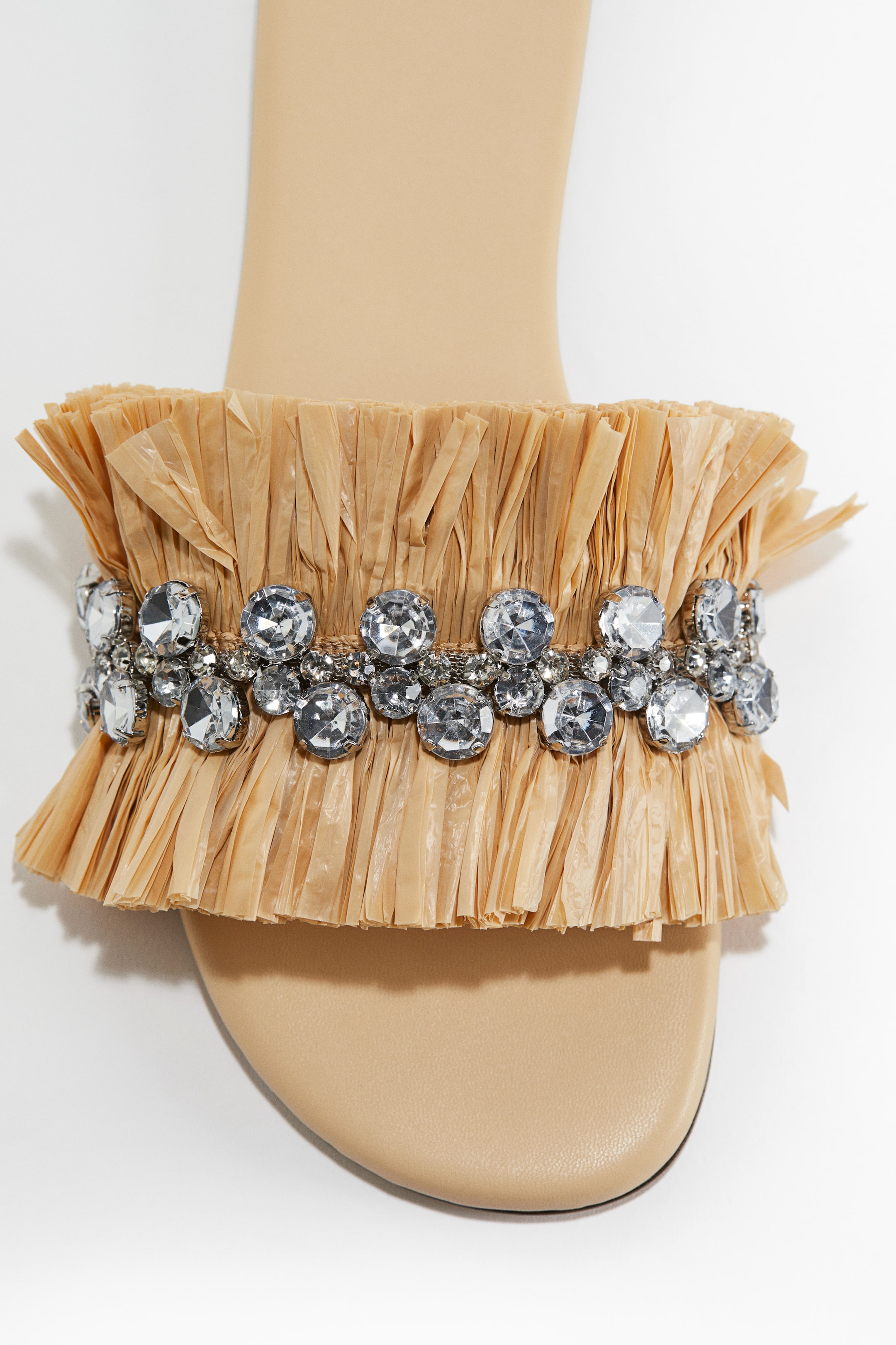 Sandals in coated fabric featuring rounded toes and a wide foot strap detailed with plastic straw and sparkling rhinestones. Jersey linings.