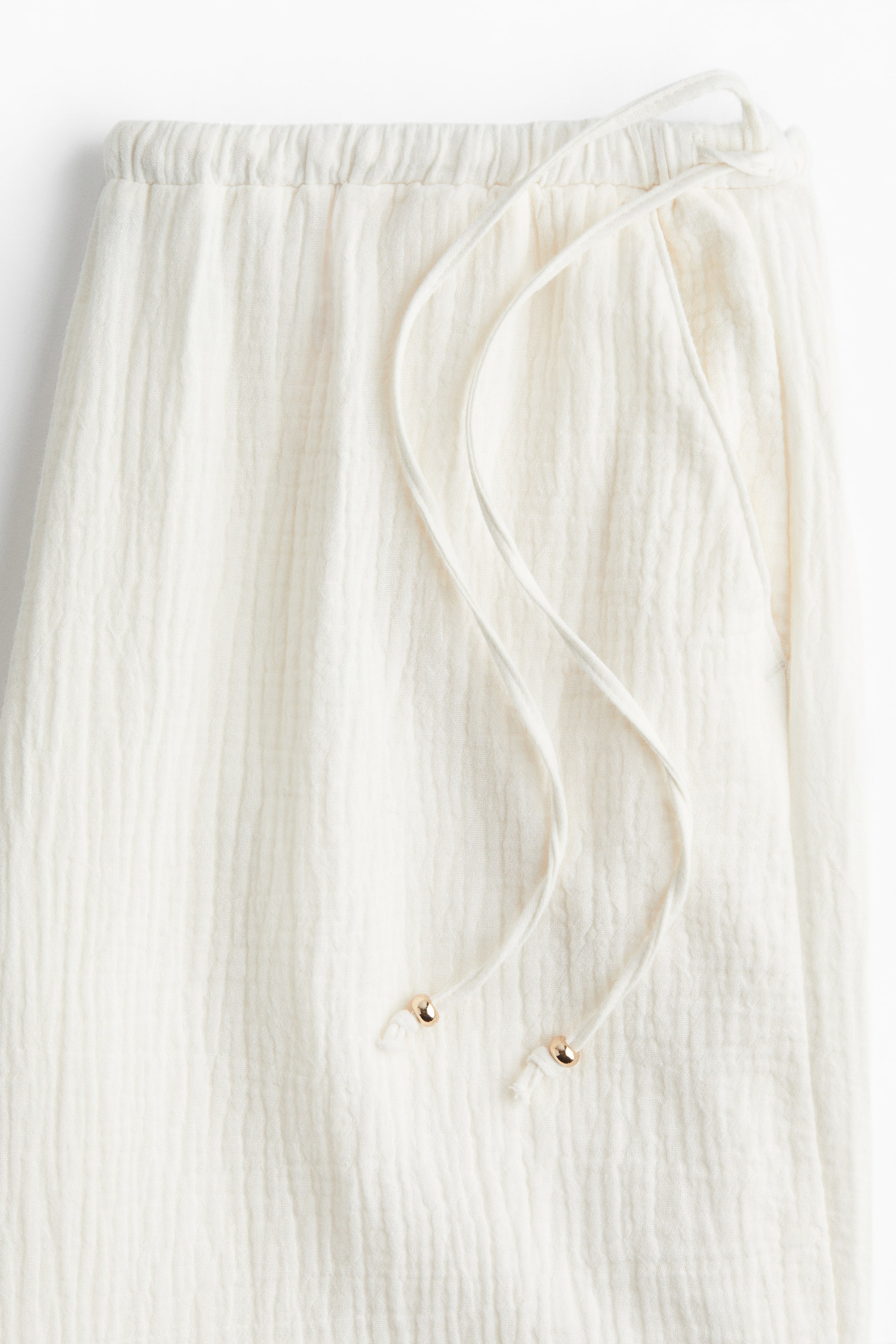 Luźne tkaninowe spodnie z niskim stanem. Elastyczna talia ściągana sznurkami wiązanymi po bokach i zakończonymi koralikami. Ukośne kieszenie po bokach i szerokie nogawki.