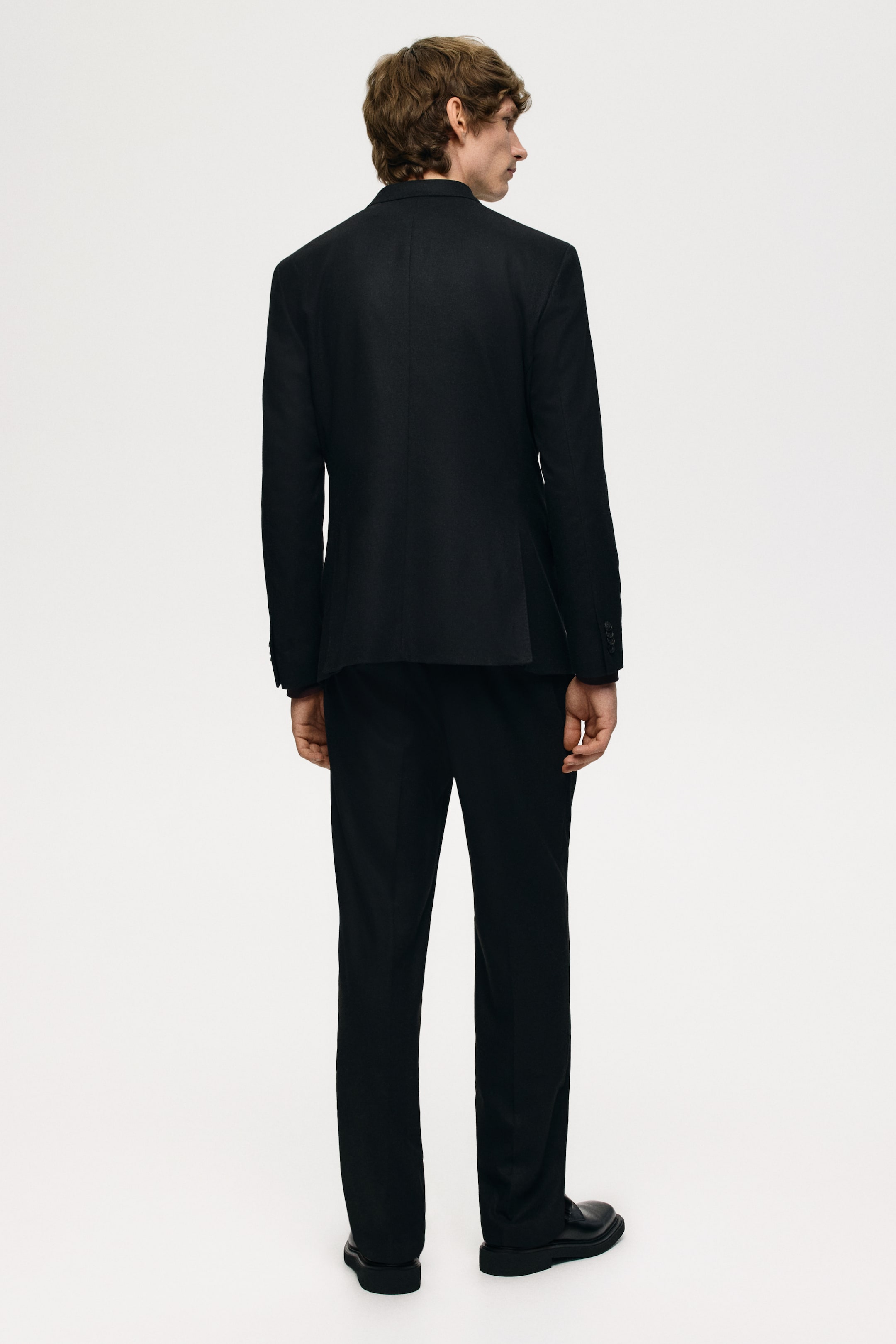 Dwurzędowa marynarka z miękkiej tkaniny. Spiczaste klapy, kieszeń na piersi, u dołu kieszenie z klapką, trzy kieszenie wewnętrzne. Ozdobne guziki u dołu rękawów, podwójne rozcięcie z tyłu. Normalny fason o wygodnym klasycznym kroju. Z podszewką.