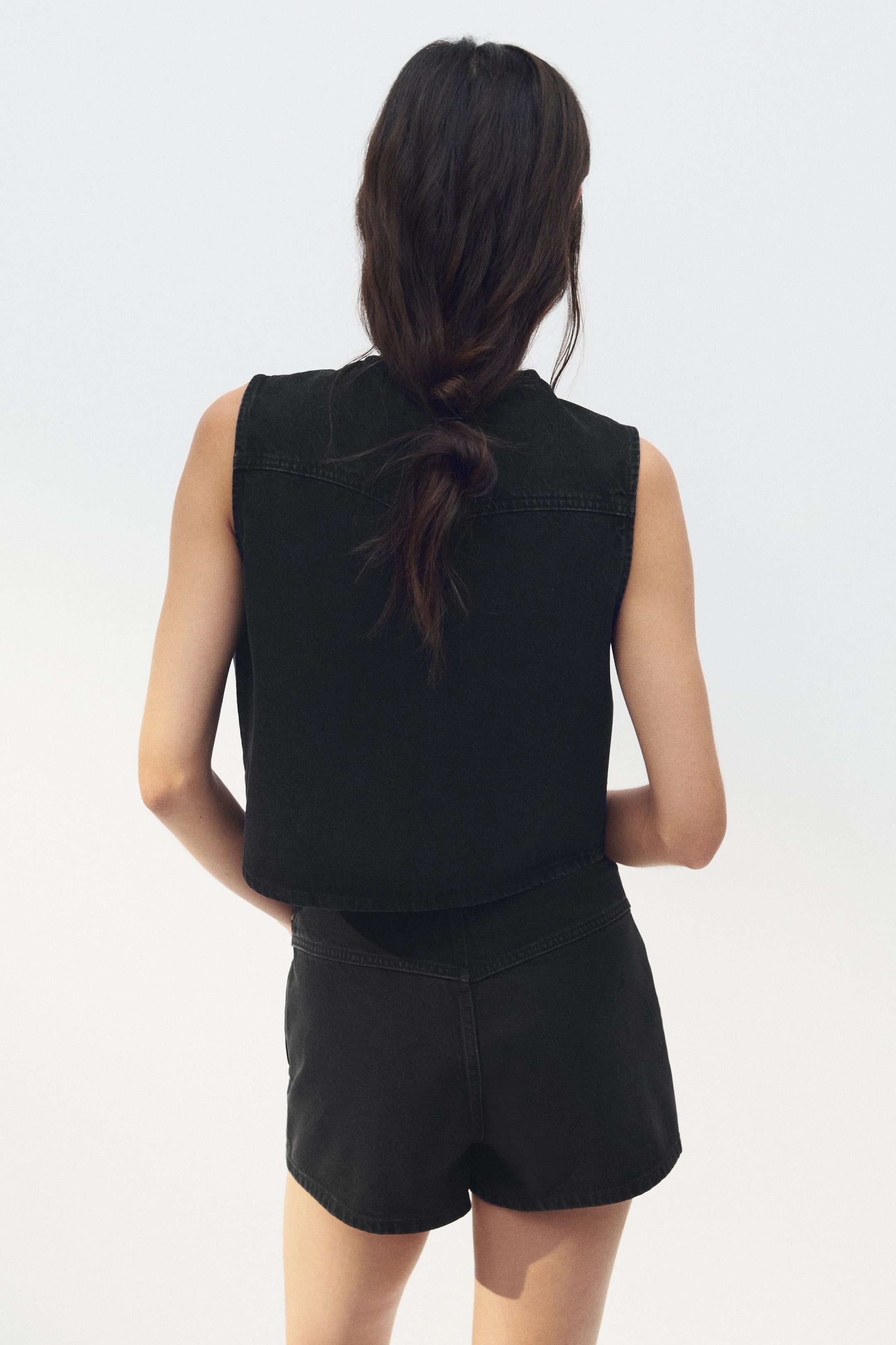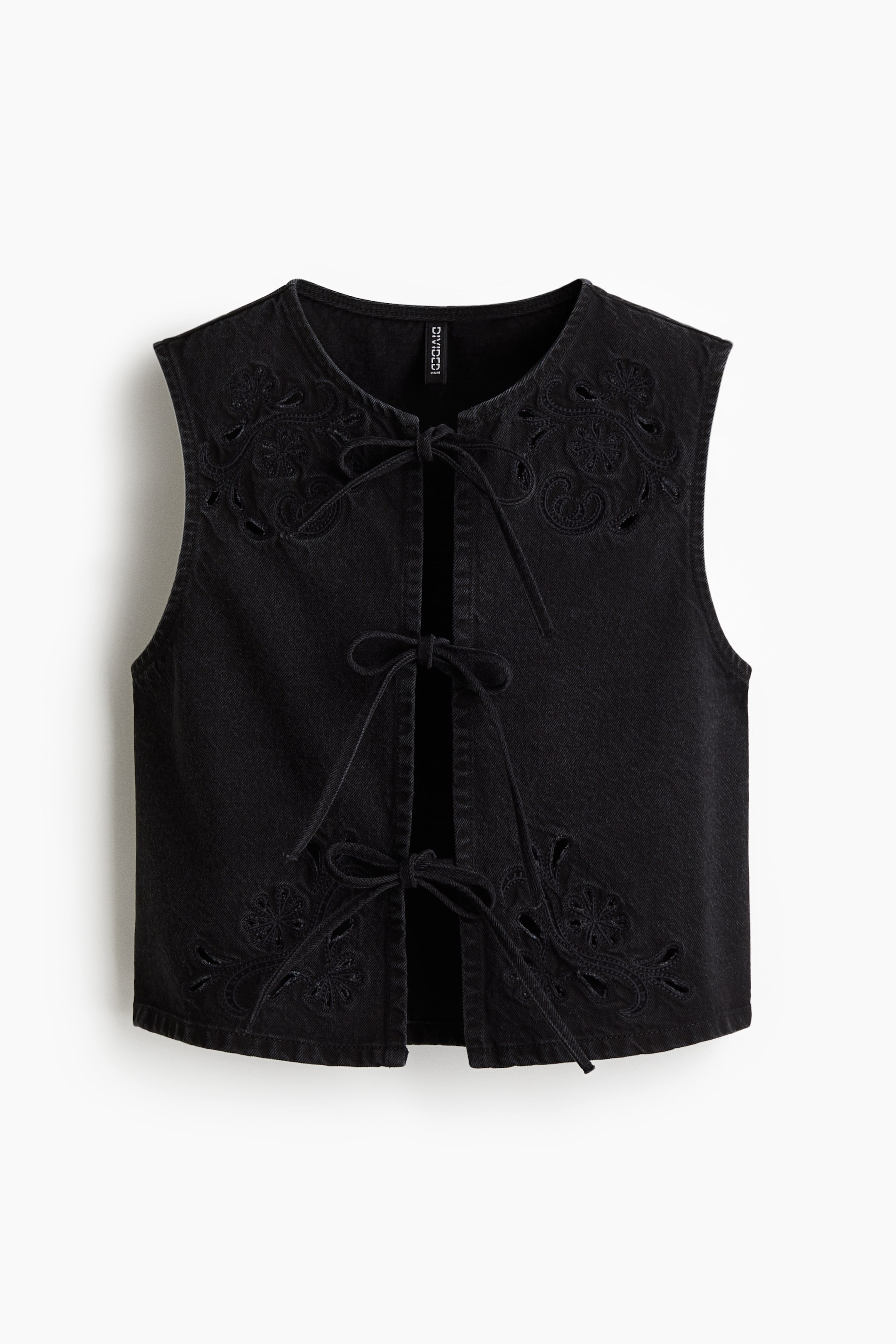 Podkreślająca figurę krótka kamizelka ze sztywnego bawełnianego denimu z wyszywanymi motywami i z haftem angielskim. Okrągły dekolt, z przodu wiązanie na trzy pary wąskich tasiemek, karczek z tyłu.