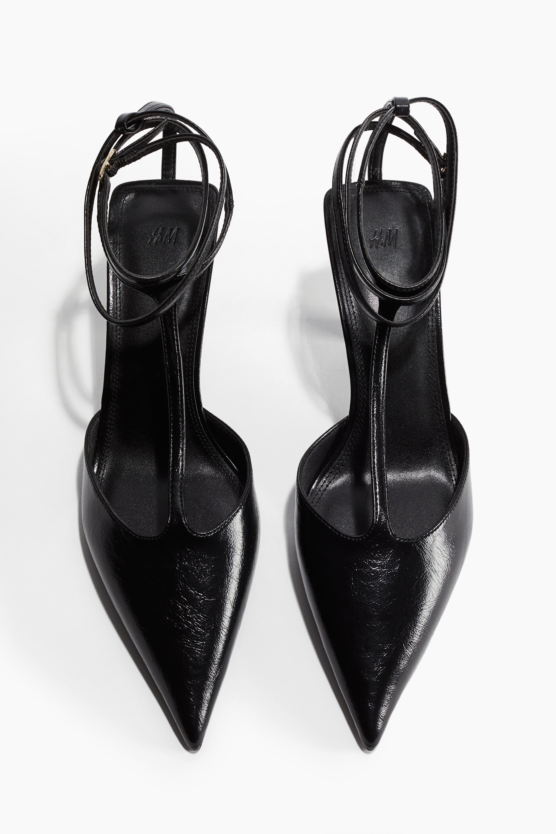 Buty z powlekanego materiału. Pasek wzdłuż stopy łączący przód z wąskim regulowanym paskiem do owijania wokół kostki. Ostre czubki, obciągane obcasy. Satynowa wyściółka.