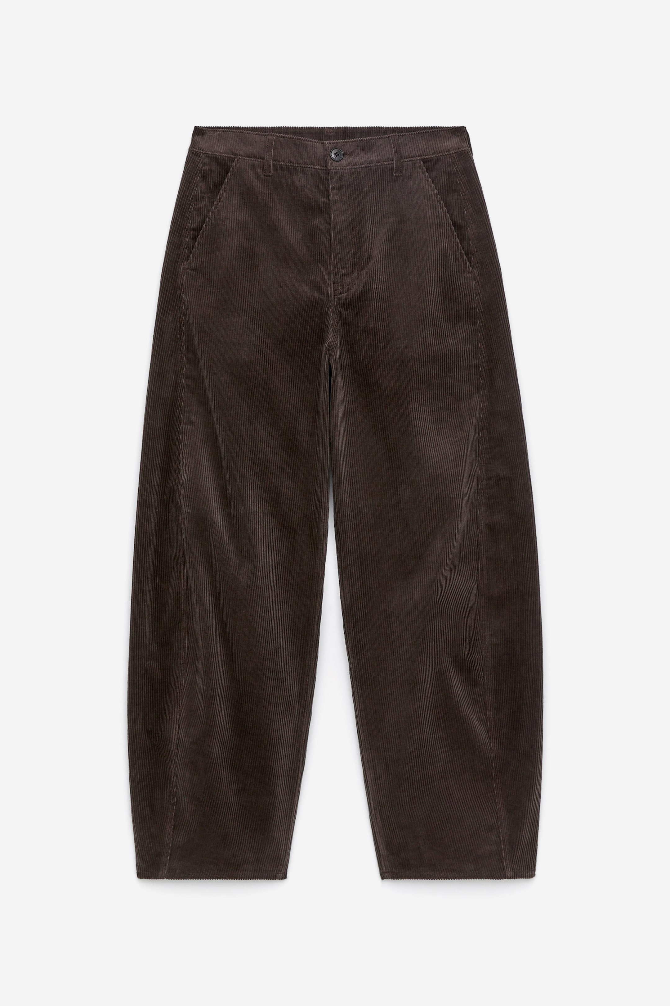 Sztruksowe spodnie z nogawkami typu barrel, skośnymi kieszeniami po bokach, pojedynczą wpuszczaną kieszenią z tyłu i normalną talią.