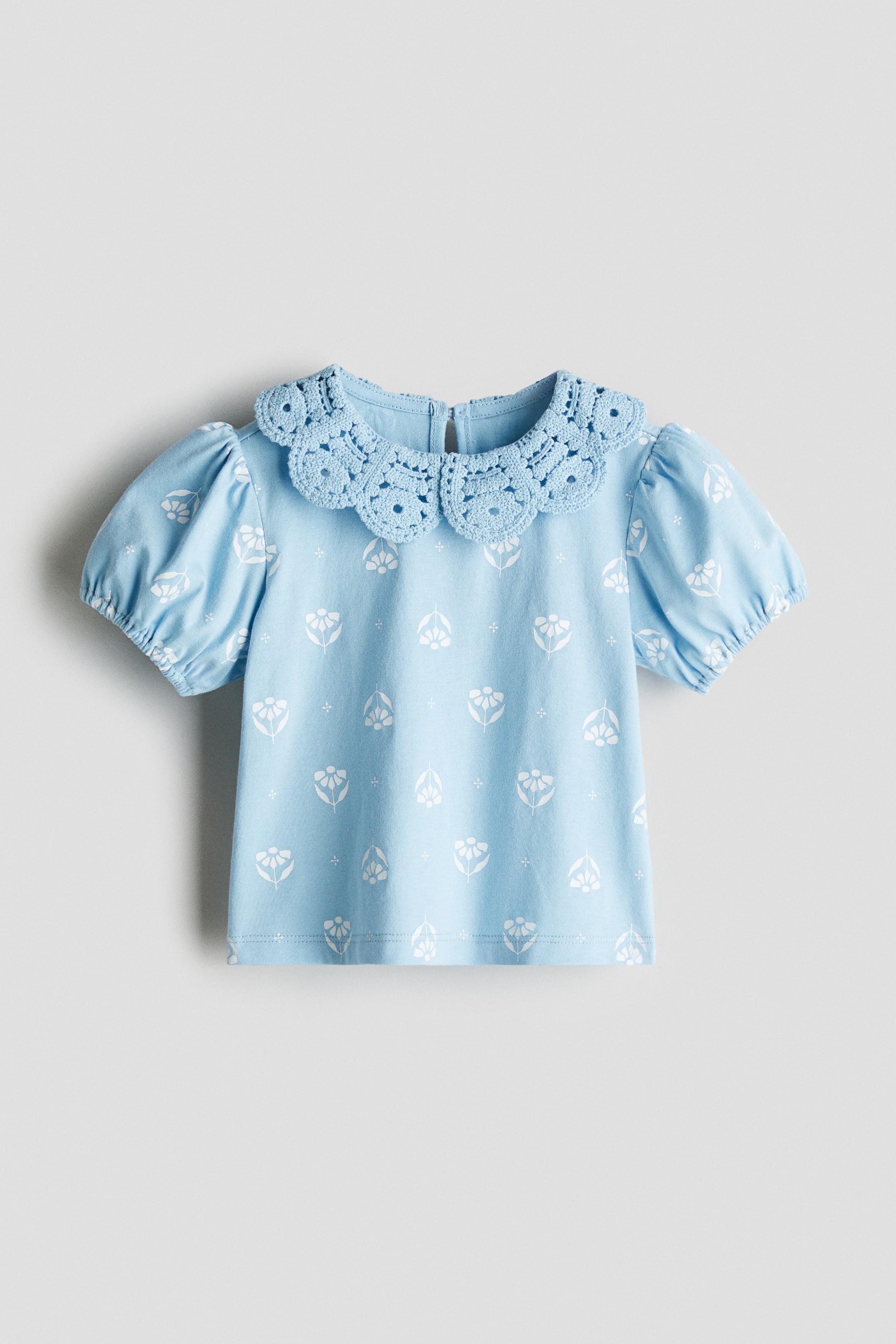 Top z miękkiego bawełnianego dżerseju. Okrągły dzianinowy kołnierzyk o wyglądzie szydełkowej robótki i z falistym brzegiem. Okrągły dekolt, na karku małe rozcięcie z guzikiem, bufiaste rękawy z elastycznym brzegiem.