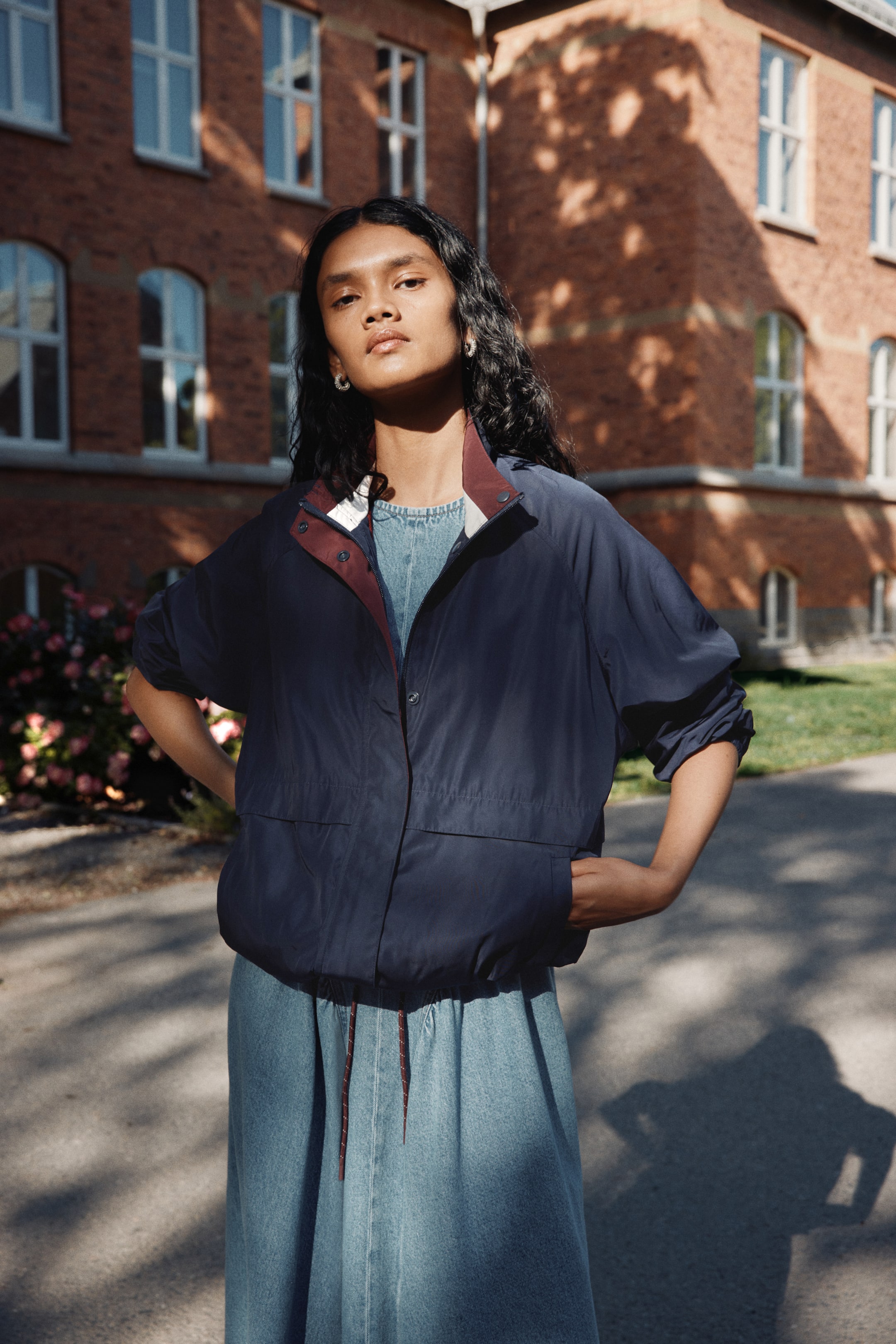 Oversized windbreaker in twill with a stand-up collar and a zip and wind flap with press-studs down the front. Long raglan sleeves with narrow elastication at the cuffs, welt front pockets and a concealed drawstring at the hem. Mesh lining.