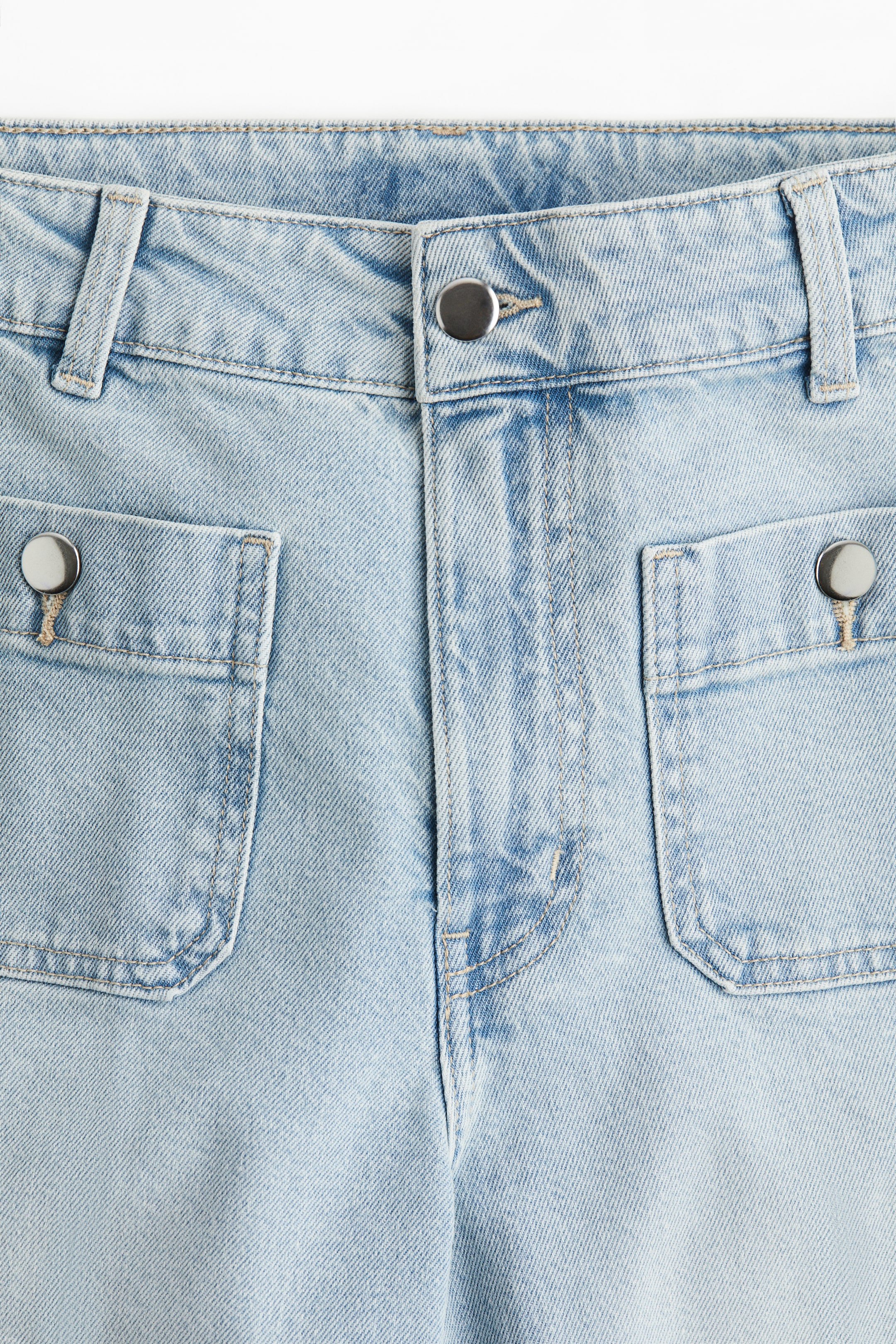 Dżinsy z bawełnianego denimu z lekkim stretchem zapewniającym wygodę. Normalny fason talii i bioder, szeroki krój nogawek. Wysoki stan, rozporek na suwak i guzik. Z przodu kieszenie z guzikiem, z tyłu kieszenie bez zapięcia, kanty z przodu. Długość do kostki. Wyglądają doskonale w każdej stylizacji.