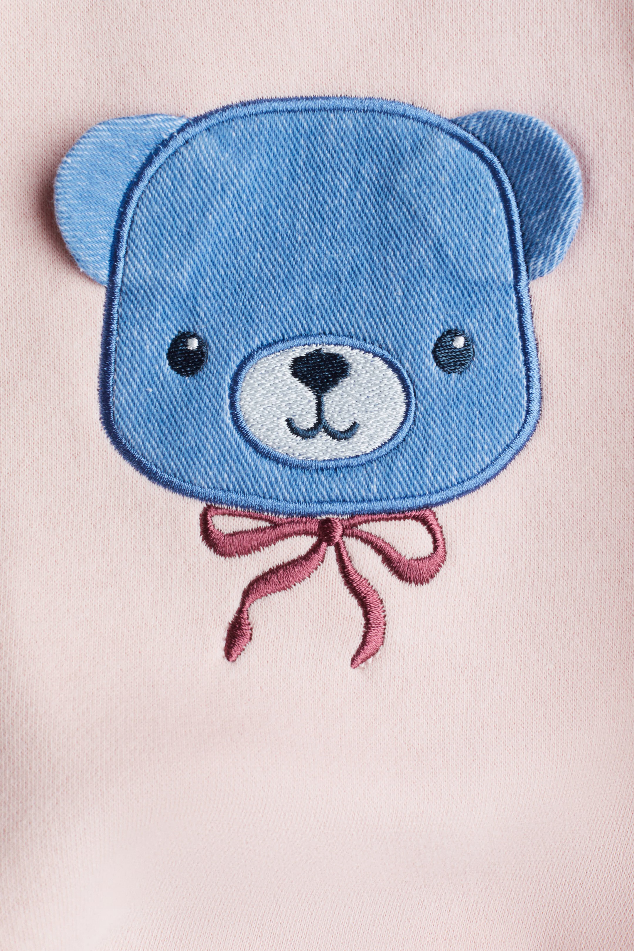 Bluza z dzianiny dresowej z miękkim meszkiem wewnątrz i ozdobnymi motywami z przodu. Okrągły dekolt ze ściągaczem i z zatrzaskami z boku (oprócz rozm. 98-104), obniżone ramiona, rękawy i dół ze ściągaczem.