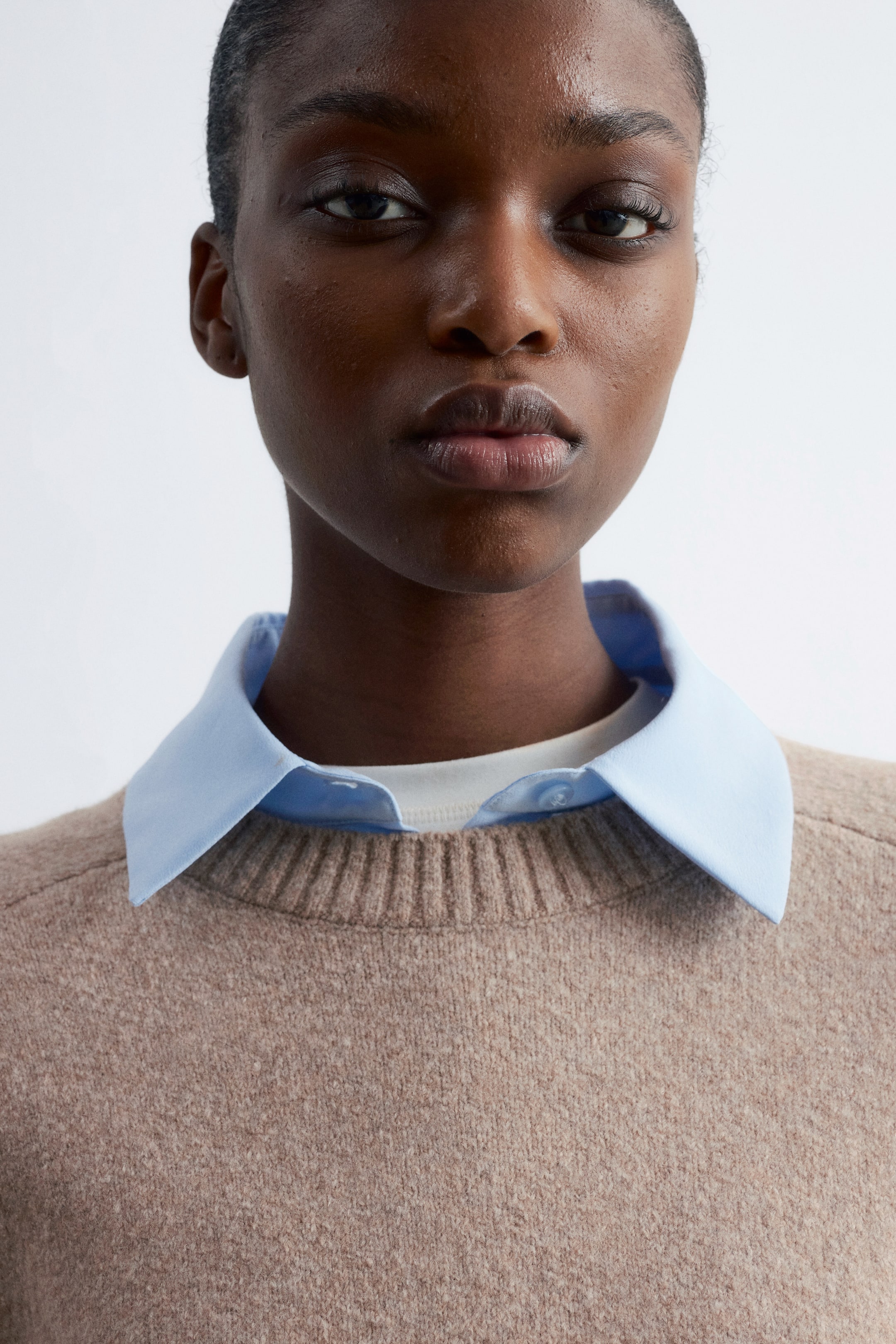 Sweter wykonany z miękkiej mieszanki bawełny i wełny. Luźny fason z okrągłym dekoltem, długimi rękawami i wykończeniami w prążki. Można go nosić samodzielnie lub jako element warstwowy w chłodniejsze miesiące. Długość: 53,5 cm (rozmiar S)