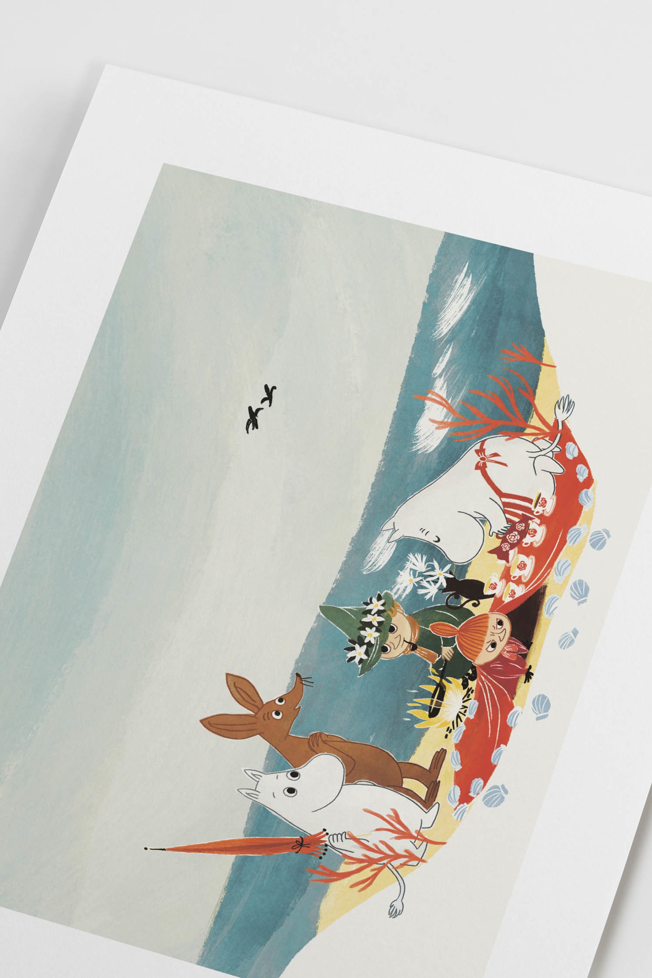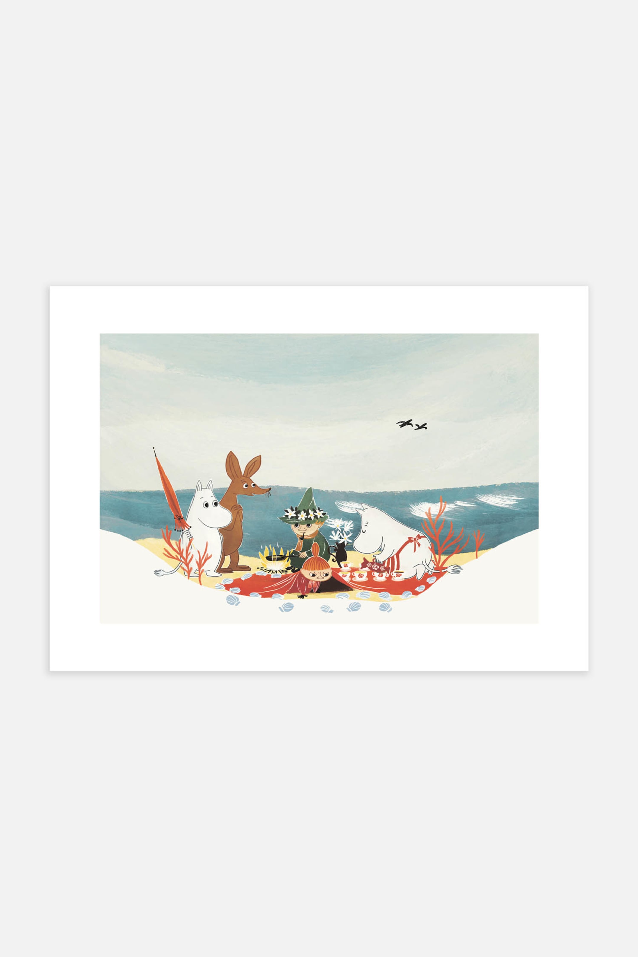 Ilustracja Doliny Muminków nad oceanem. Muminek, Włóczykij, Snufkin, Mama Muminka i Mała Mi mają piknik. Motyw jest oprawiony w wbudowany passepartout.