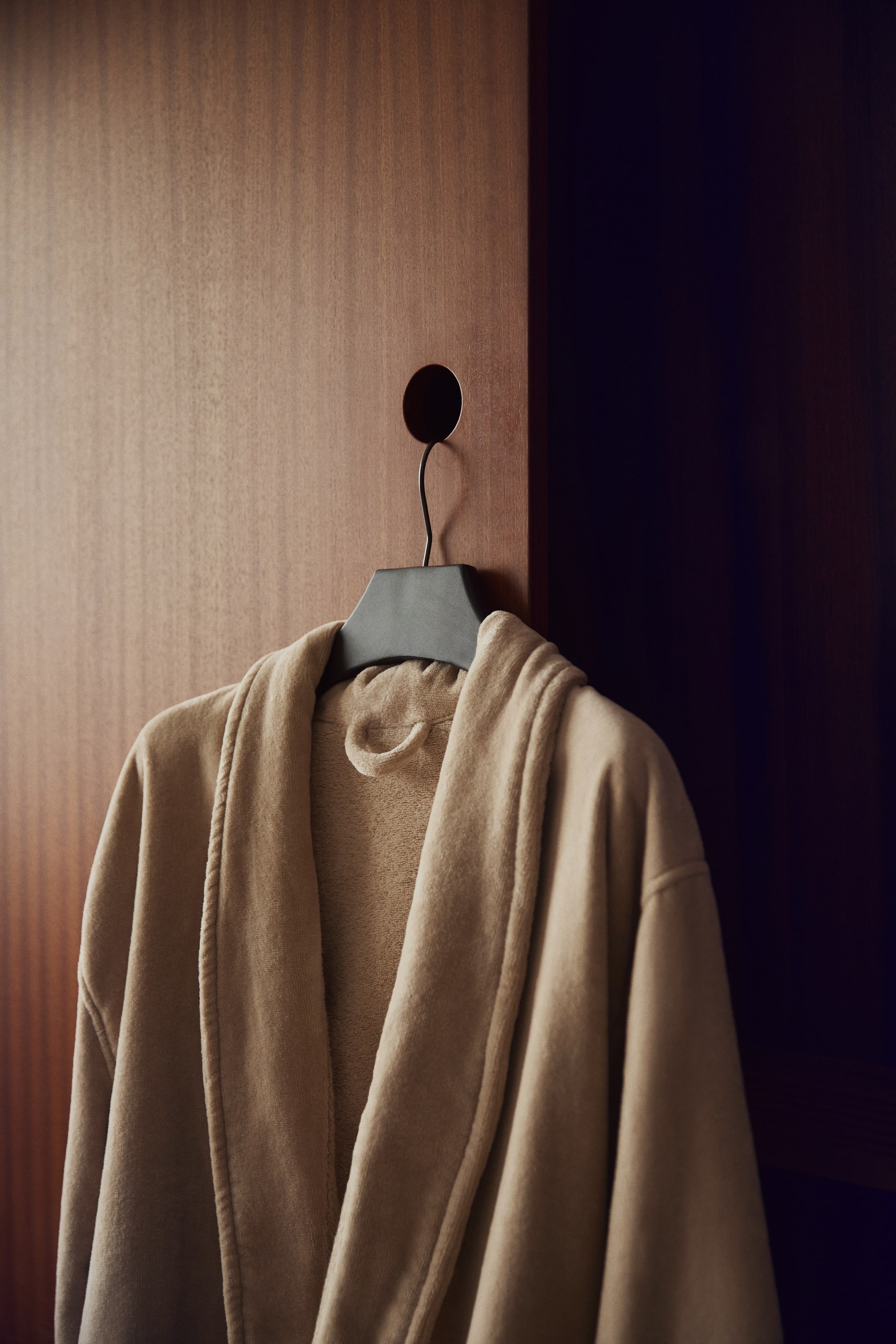 Szlafrok z miękkiego bawełnianego weluru z szalowym kołnierzem. Kieszenie po bokach, w talii wyjmowany pasek do wiązania.
