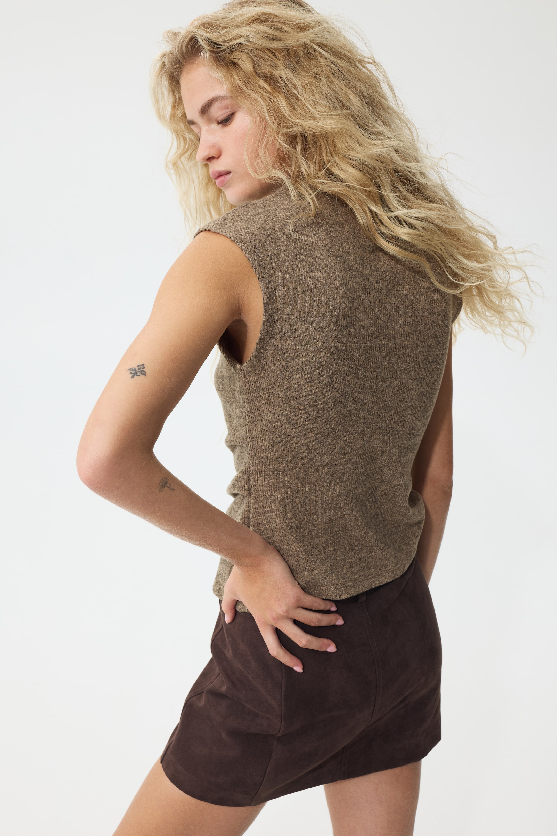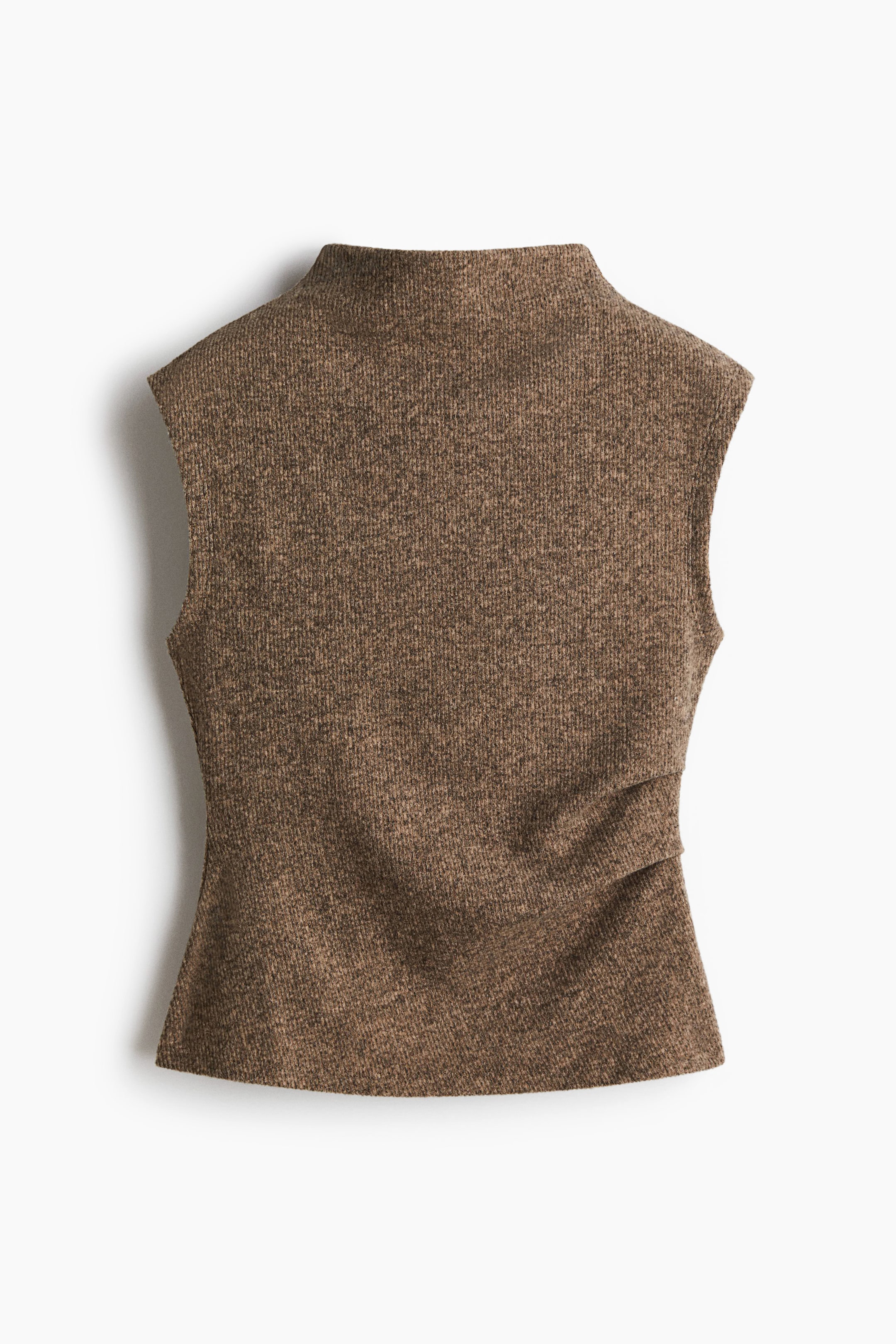 Podkreślający figurę top bez rękawów wykonany z miękkiej dzianiny w prążki. Półgolfowy kołnierz, zakładki na jednym boku.