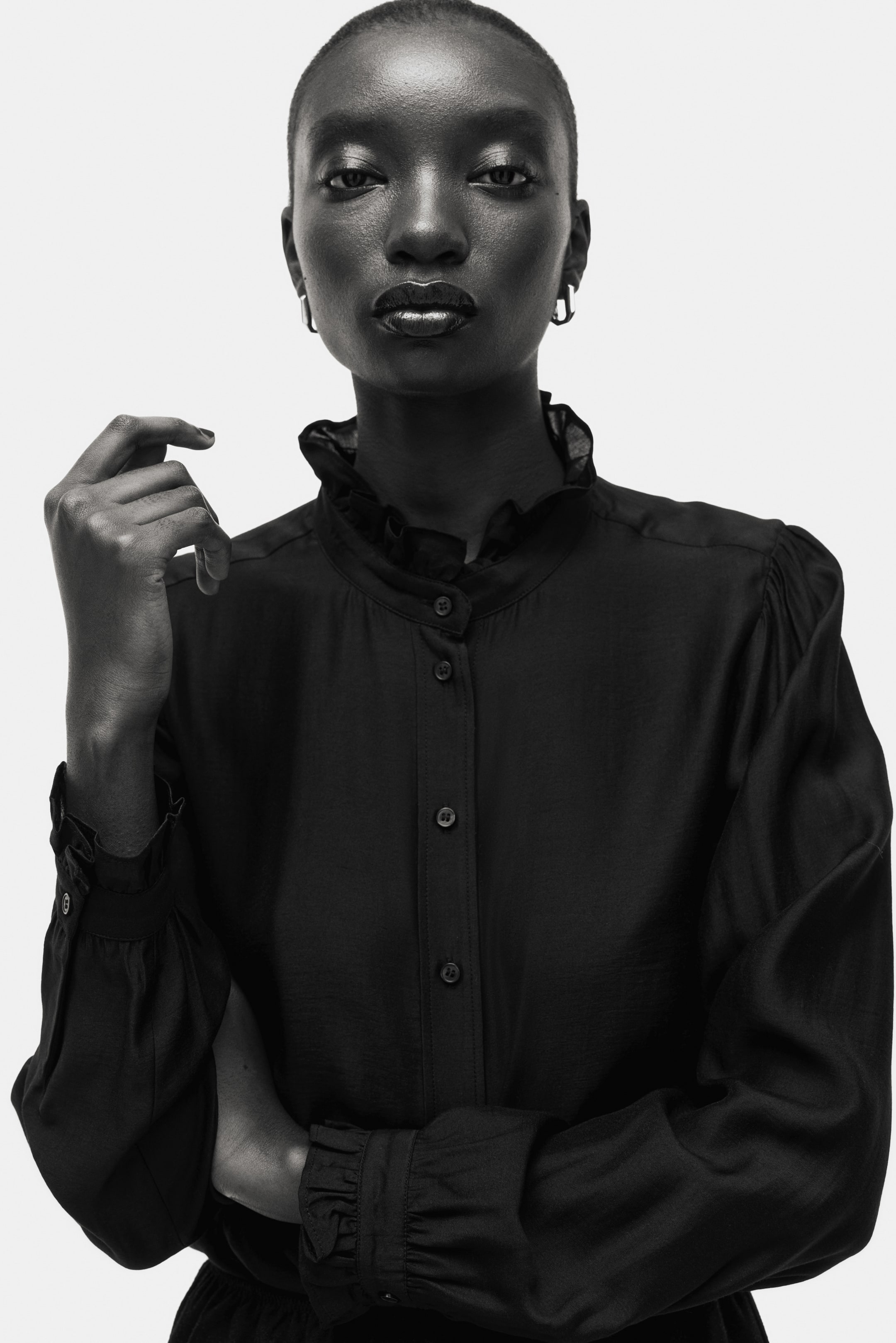 Bluzka z miękkiej tkaniny z mieszanki zawierającej wiskozę. Kołnierz z falbanką, zapięcie na guziki, długie bufiaste rękawy z falbanką i mankietem na guzik. Zaokrąglony dół.