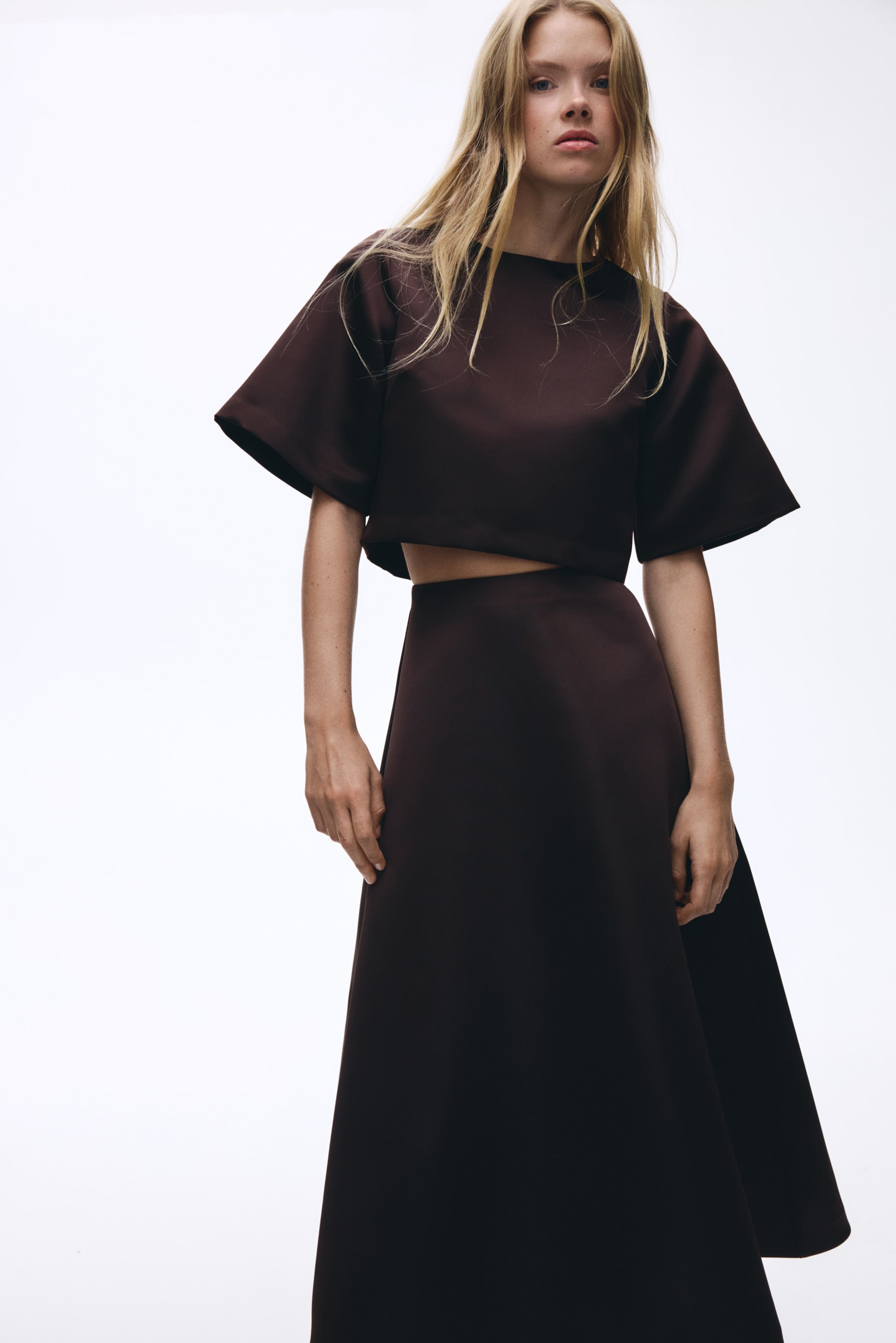 Krótki top z grubej tkaniny. Okrągły dekolt, na karku niewielkie rozcięcie z guzikiem. Szerokie rękawy niemal do łokcia.