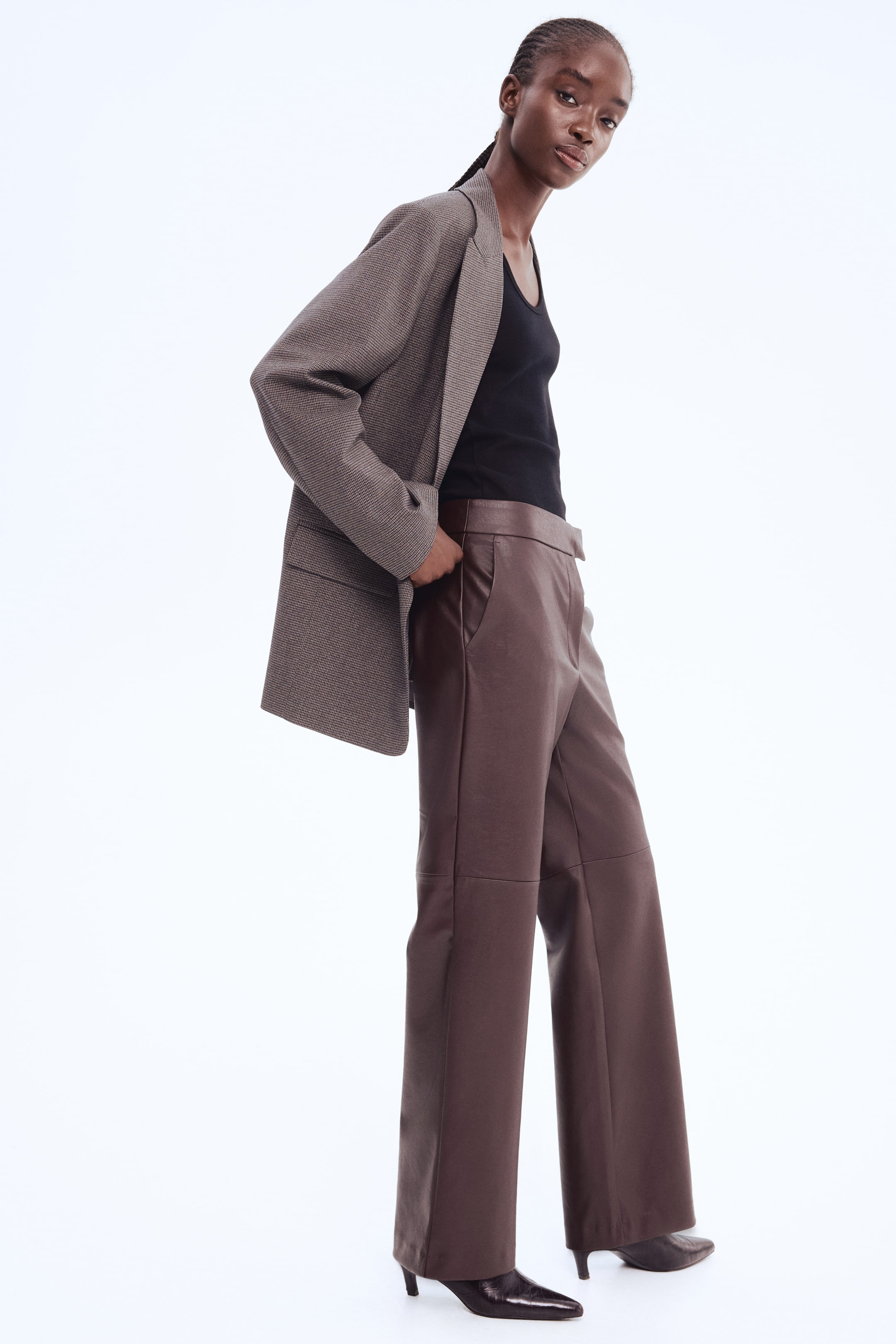 Spodnie z powlekanego materiału. Rozporek na suwak, w talii przedłużony pas z krytym zapięciem na guzik i dużą haftkę. Ukośne kieszenie po bokach, z tyłu jedna atrapa kieszeni z wypustką, proste nogawki ze szwem powyżej kolan.