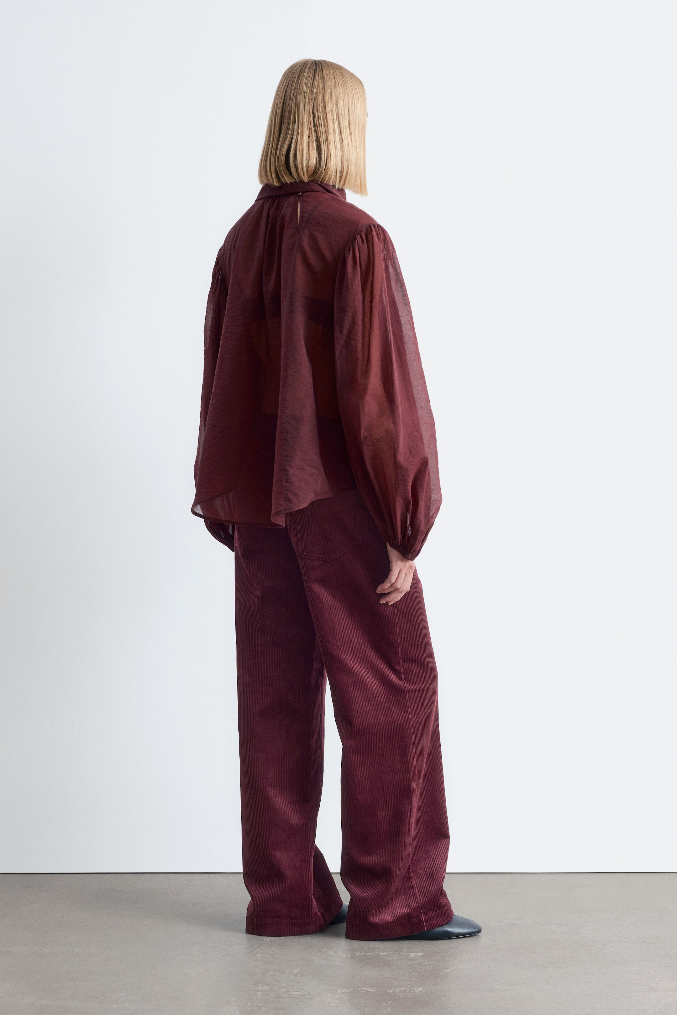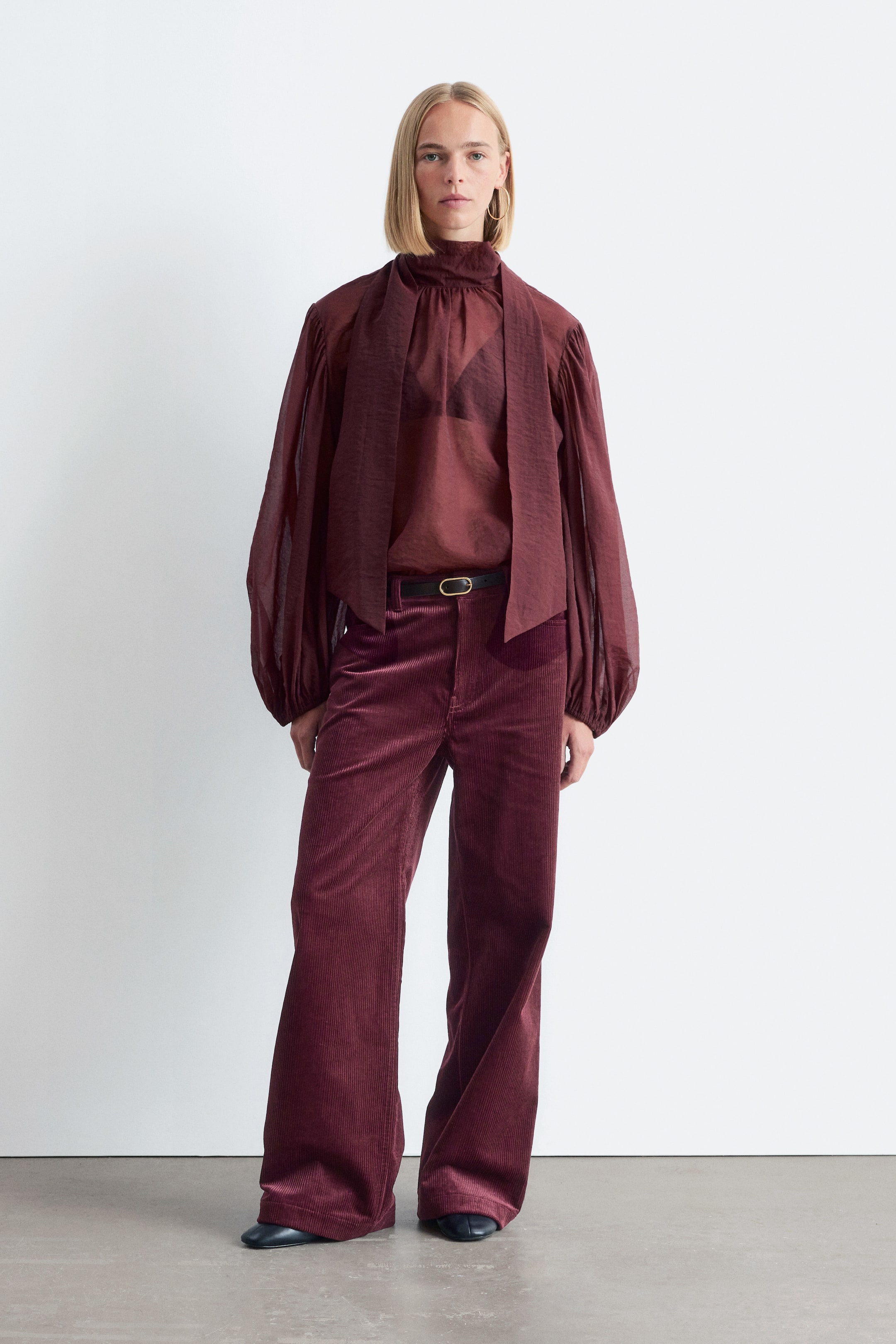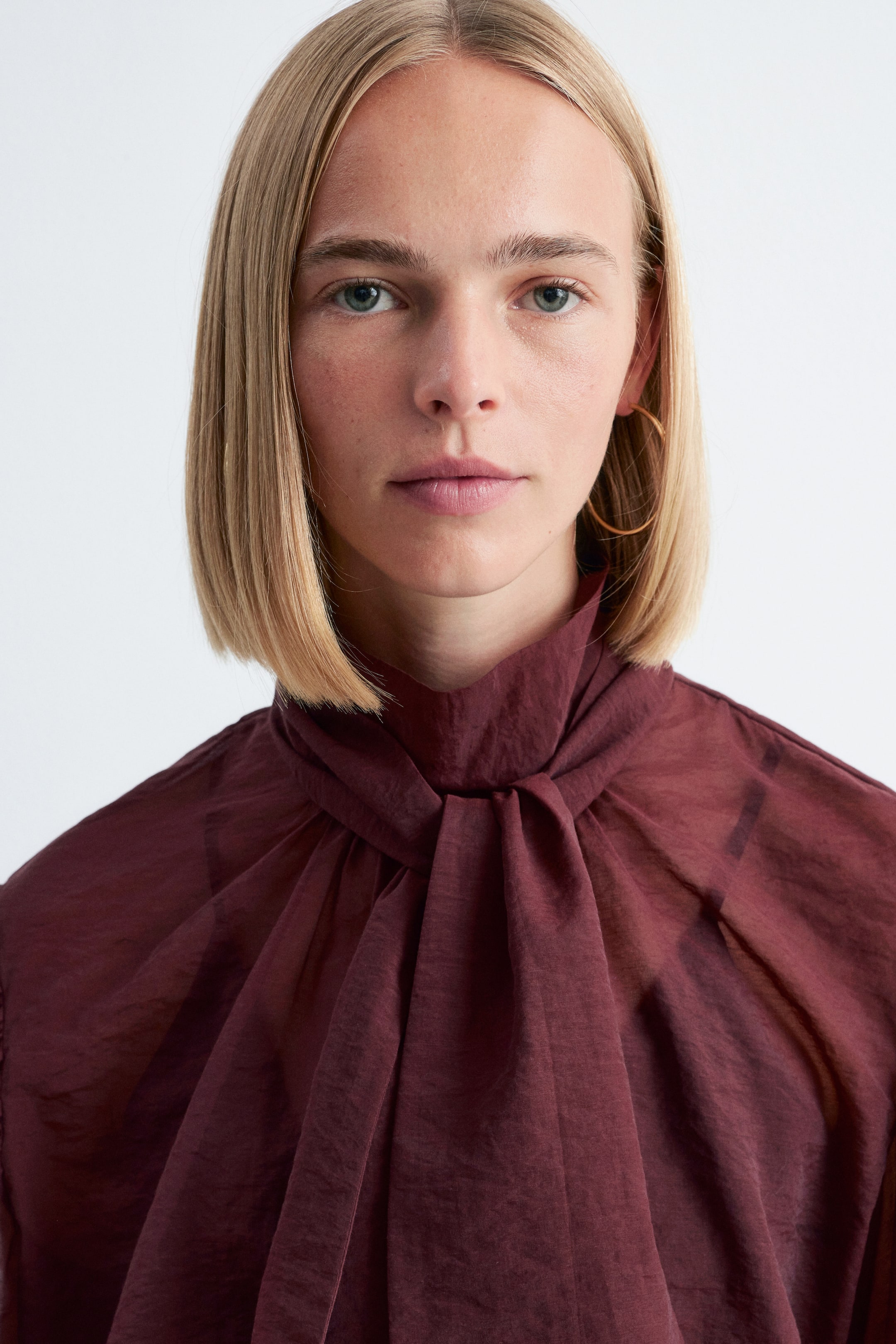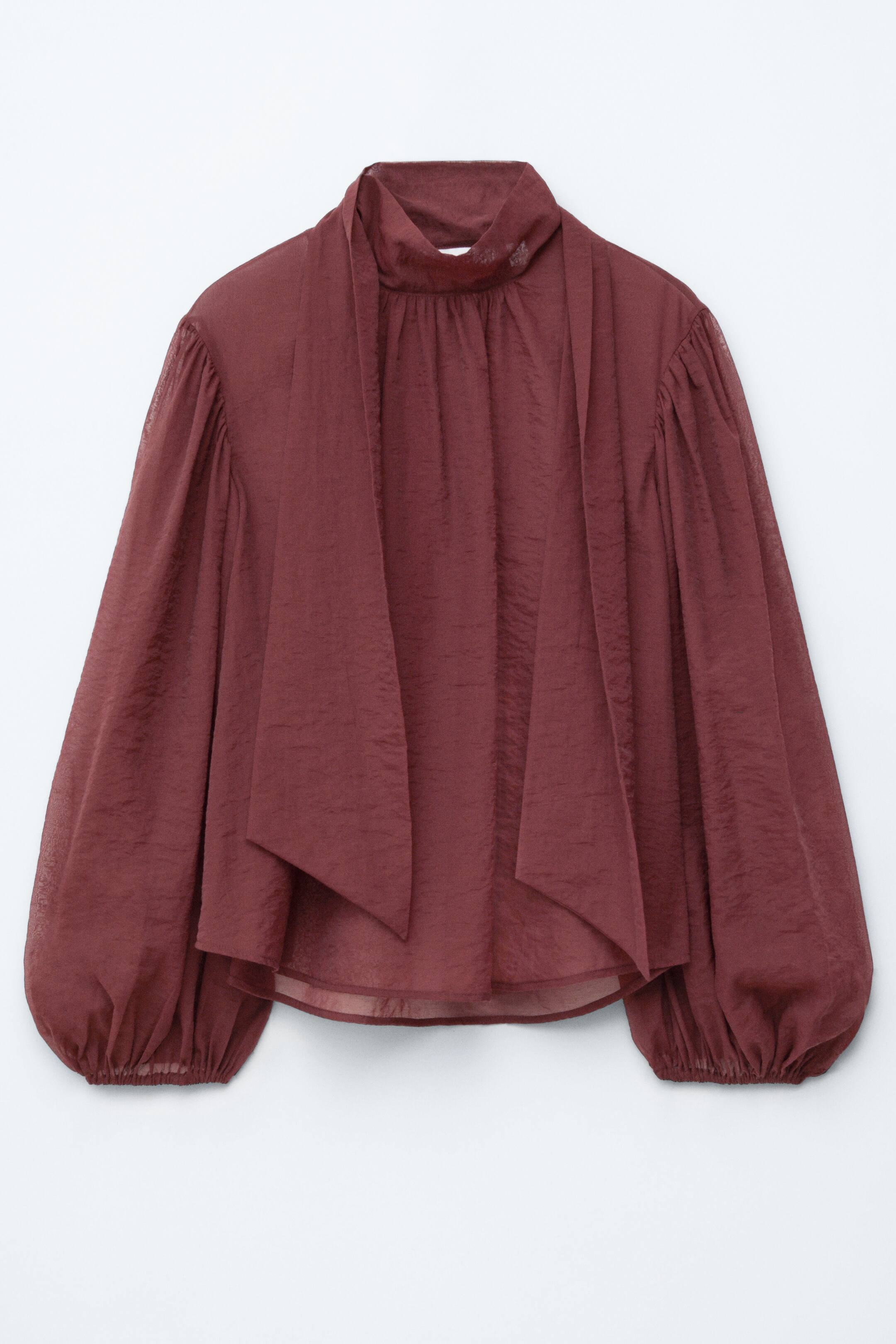 Bluzka z krepy z tasiemkowym kołnierzykiem z wiązaniem i otwórz zapięciem na guzik z tyłu. Delikatnie obniżona linia ramiom i długie, obszerne bufiaste rękawy z elastycznymi mankietami. Standardowy fason Długość: 66 cm (rozmiar S)